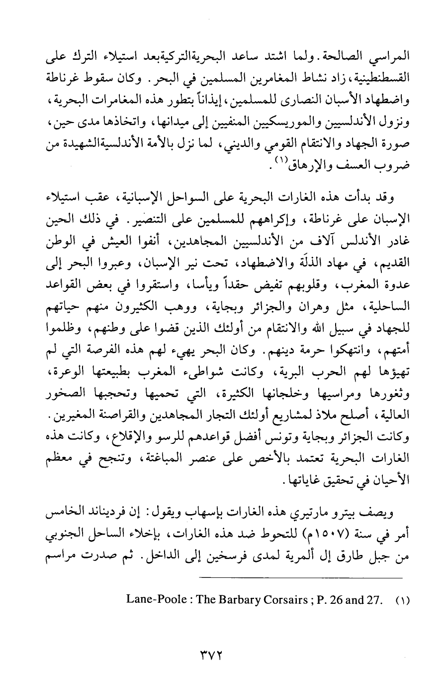 المراسي الصالحة. ولما اشتد ساعد البحرية التركية بعد استيلاء الترك على القسطنطينية، زاد نشاط المغامرين المسلمين في البحر. وكان سقوط غرناطة واضطهاد الأسبان النصارى للمسلمين، إيذاناً بتطور هذه المغامرات البحرية، ونزول الأندلسيين والموريسكيين المنفيين إلى ميدانها، واتخاذها مدى حين، صورة الجهاد والانتقام القومي والديني، لما نزل بالأمة الأندلسية الشهيدة من ضروب العسف والإرهاق (1).