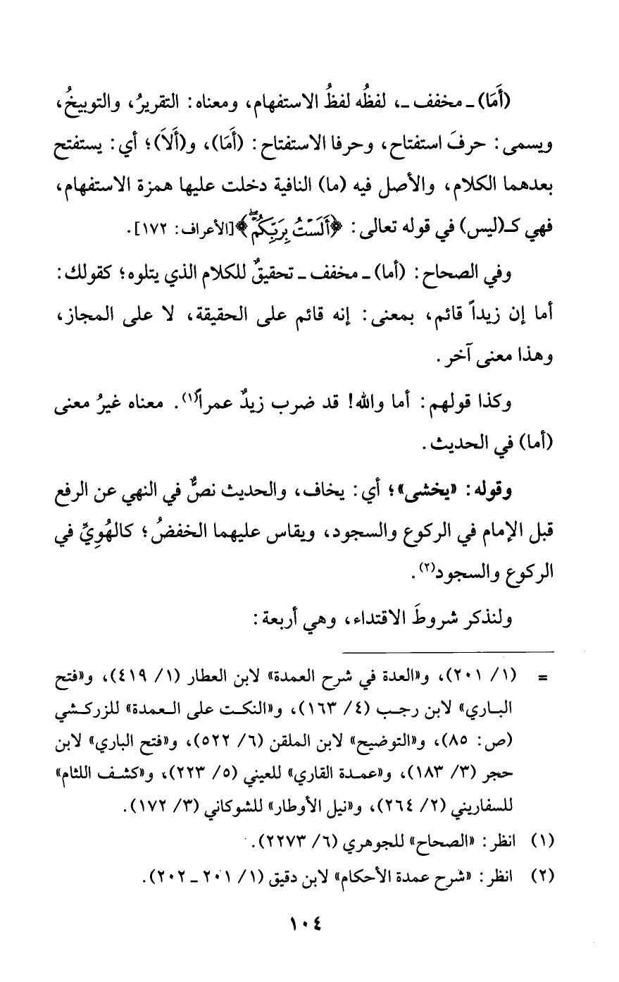 ولنذكر شروط الاقتداء، وهي أربعة: