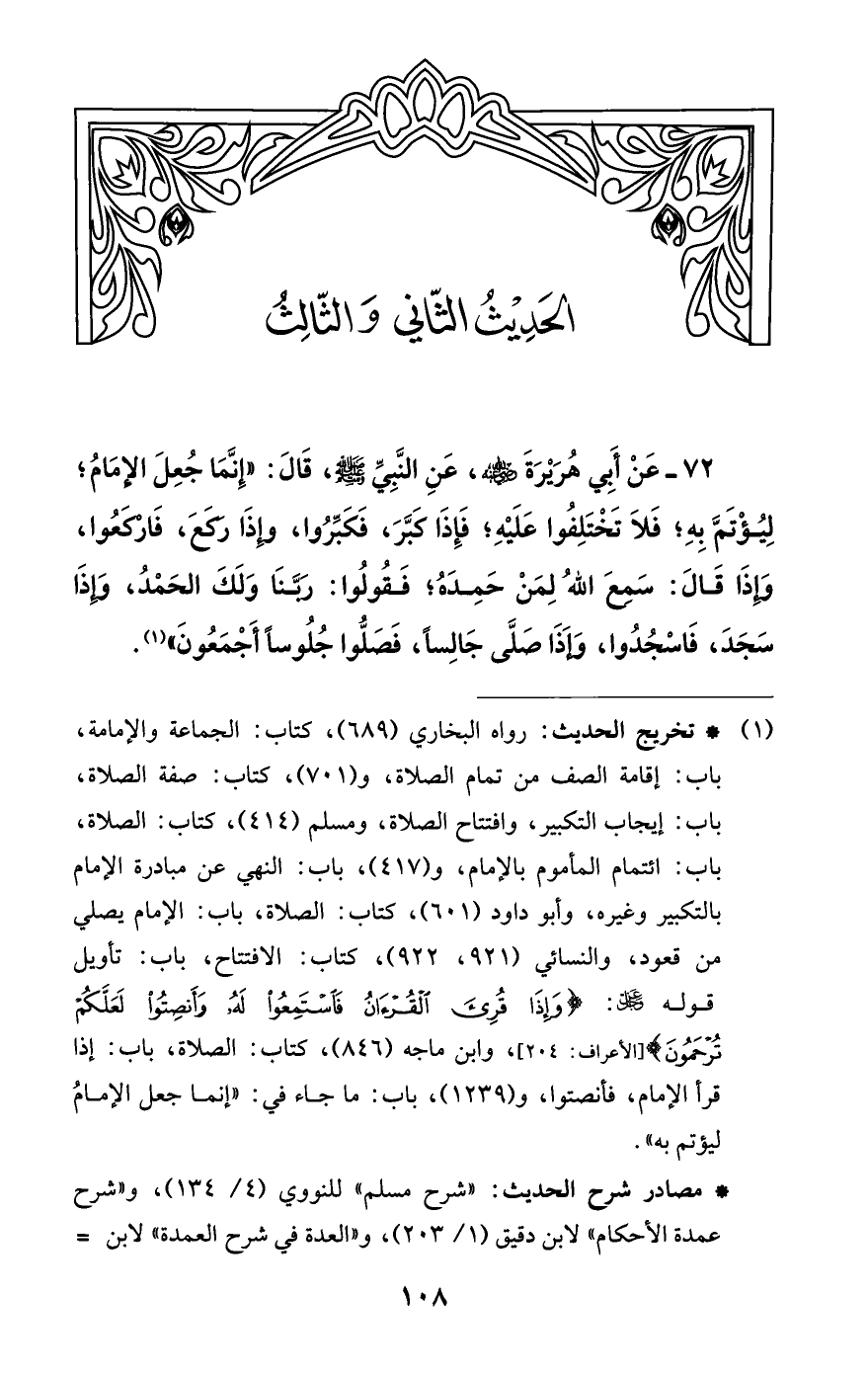 72 - عَنْ أَبِي هُرَيْرَةَ - رضي الله عنه -، عَنْ النَّبِيِّ - صلى الله عليه وسلم -، قَالَ: «إنَّمَا جُعِلَ الإِمَامُ؛ لِيُؤْتَمَّ بِهِ؛ فَلا تَخْتَلِفُوا عَلَيْهِ؛ فَإِذَا كَبَّرَ، فَكَبِّرُوا , وَإِذَا رَكَعَ، فَارْكَعُوا، وَإِذَا قَالَ: سَمِعَ اللَّهُ لِمَنْ حَمِدَهُ؛ فَقُولُوا: رَبَّنَا وَلَكَ الْحَمْدُ، وَإِذَا سَجَدَ، فَاسْجُدُوا، وَإِذَا صَلَّى جَالِساً، فَصَلُّوا جُلُوساً أَجْمَعُونَ» (¬1).