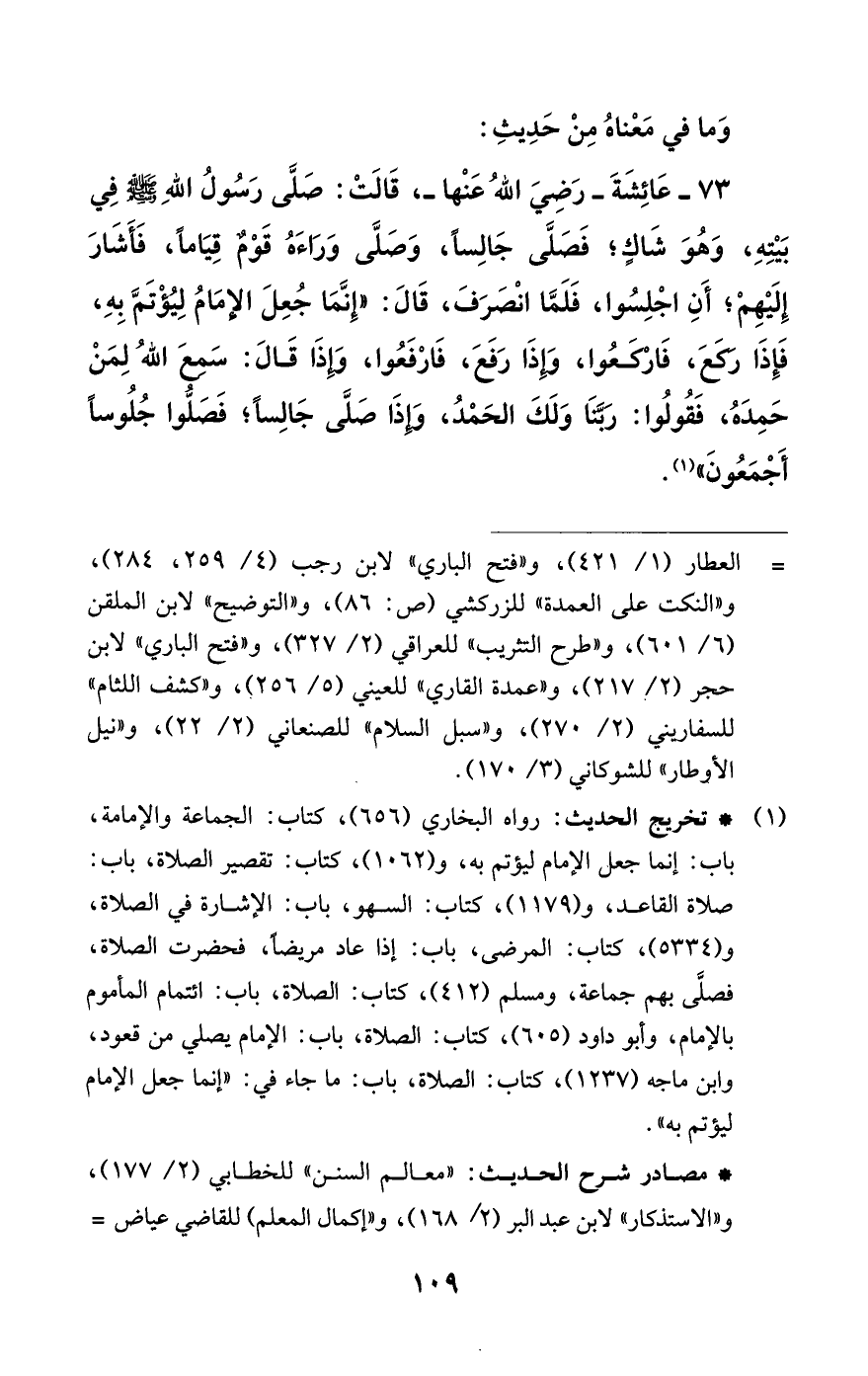 73 - عَائِشَةَ رضي الله عنها، قَالَتْ: صَلَّى رَسُولُ اللَّهِ - صلى الله عليه وسلم - فِي بَيْتِهِ، وَهُوَ شَاكٍ؛ فَصَلَّى جَالِساً , وَصَلَّى وَرَاءَهُ قَوْمٌ قِيَاماً , فَأَشَارَ إلَيْهِمْ؛ أَنِ اجْلِسُوا، فَلَمَّا انْصَرَفَ، قَالَ: «إنَّمَا جُعِلَ الإِمَامُ لِيُؤْتَمَّ بِهِ , فَإِذَا رَكَعَ، فَارْكَعُوا , وَإِذَا رَفَعَ، فَارْفَعُوا , وَإِذَا قَالَ: سَمِعَ اللَّهُ لِمَنْ حَمِدَهُ، فَقُولُوا: رَبَّنَا وَلَكَ الْحَمْدُ , وَإِذَا صَلَّى جَالِساً؛ فَصَلُّوا جُلُوساً أَجْمَعُونَ» (¬1).