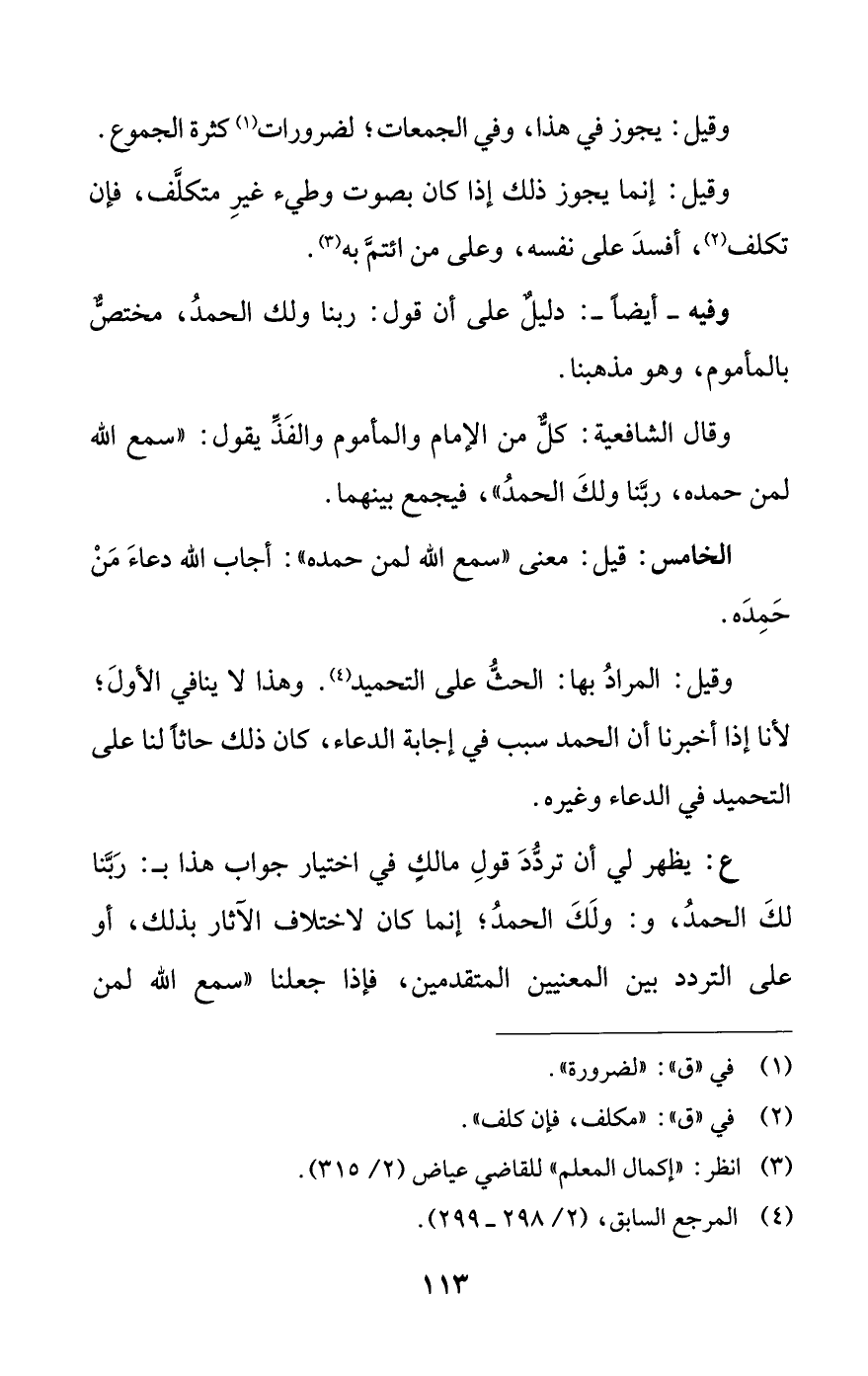 ع: يظهر لي أن تردد قول مالك في اختيار جواب هذا بـ: ربنا لك الحمد، وـ: ولك الحمد؛ إنما كان لاختلاف الآثار بذلك، أو على التردد بين المعنيين المتقدمين، فإذا جعلنا «سمع الله لمن