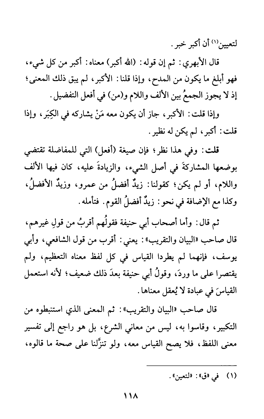 قال صاحب «البيان والتقريب»: ثم المعنى الذي استنبطوه من التكبير، وقاسوا به، ليس من معاني الشرع، بل هو راجع إلى تفسير معنى اللفظ، فلا يصح القياس معه، ولو تنزلنا على صحة ما قالوه،