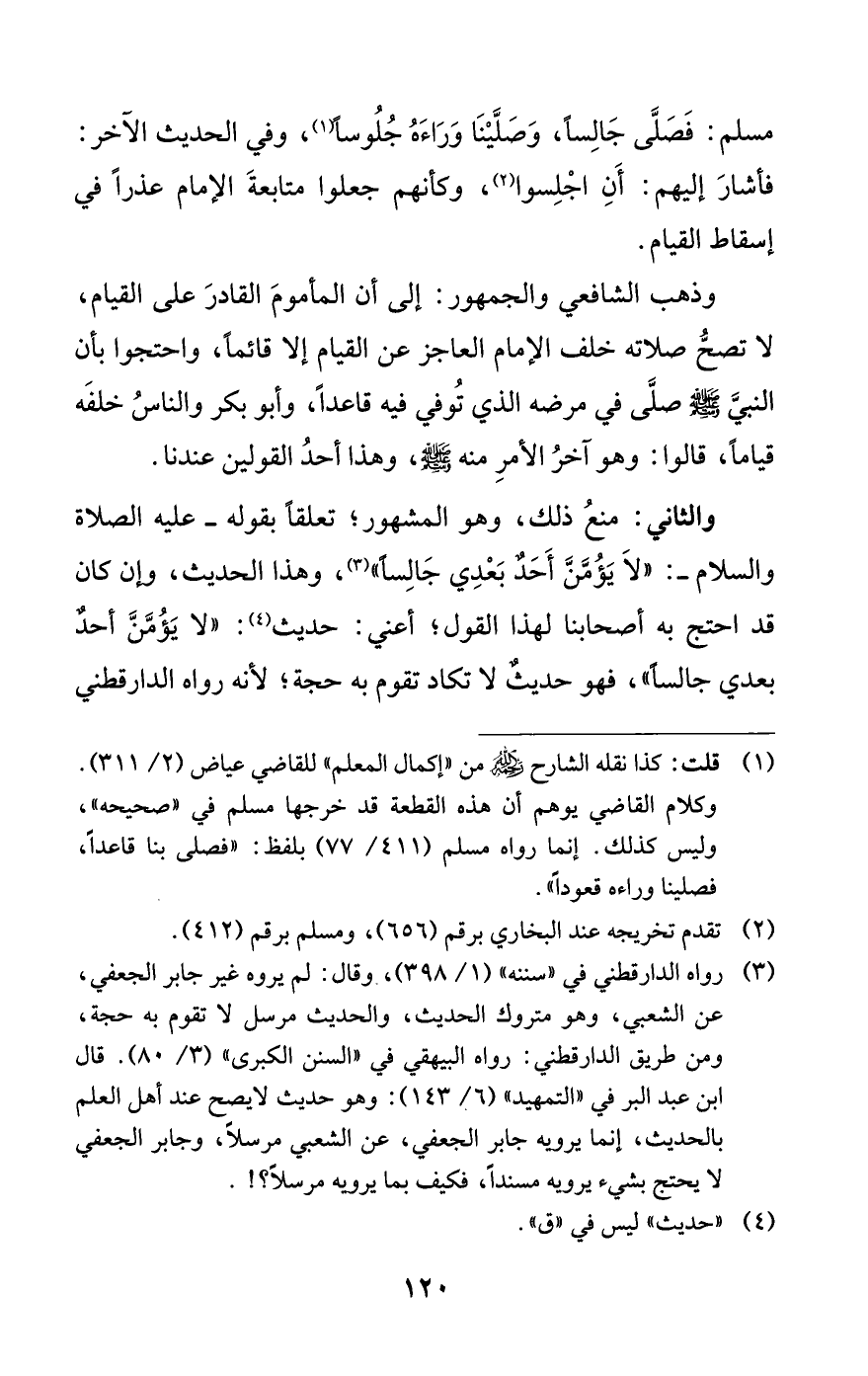 وذهب الشافعي والجمهور: إلى أن المأموم القادر على القيام، لا تصح صلاته خلف الإمام العاجز عن القيام إلا قائما، واحتجوزا بأن النبي - صلى الله عليه وسلم - صلى في مرضه الذي توفي فيه قاعدا، وأبو بكر والناس خلفه قياما، قالوا: وهو آخر الأمر منه - صلى الله عليه وسلم -، وهذا أحد القولين عندنا.