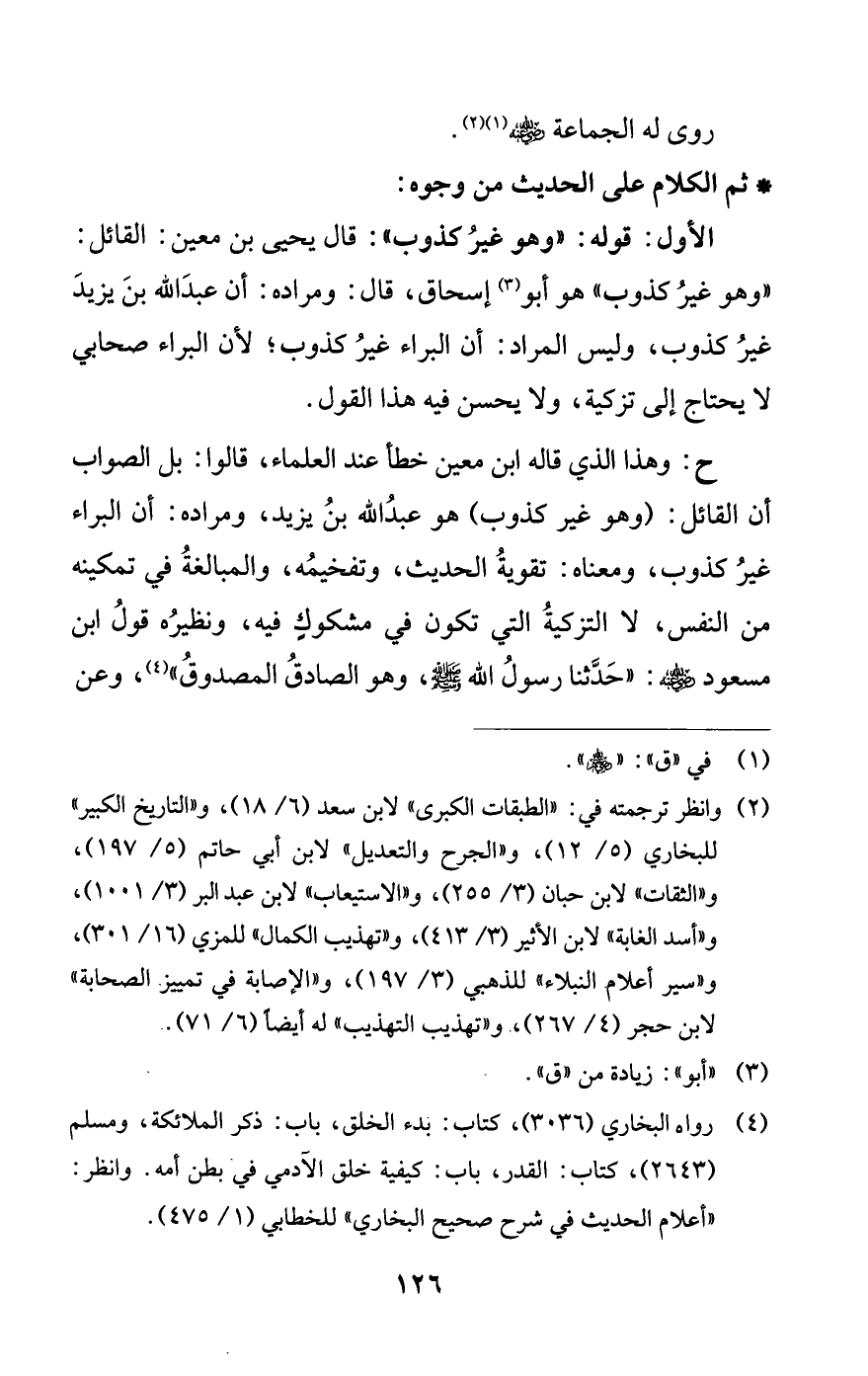 الأول: قوله: «وهو غير كذوب»: قال يحيى بن معين: القائل: «وهو غير كذوب» هو أبو (¬3) إسحاق، قال: ومراده: أن عبد الله بن يزيد غير كذوب، وليس المؤراد: أن البراء غير كذوب؛ لأن البراء صحابي لا يحتاج إلى تزكية، ولا يحسن فيه هذا القول.