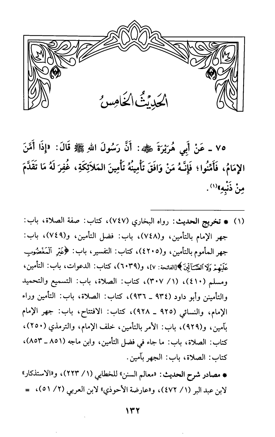 75 - عَنْ أَبِي هُرَيْرَةَ - رضي الله عنه -: أَنَّ رَسُولَ اللَّهِ - صلى الله عليه وسلم - قَالَ: «إذَا أَمَّنَ الإِمَامُ، فَأَمِّنُوا؛ فَإِنَّهُ مَنْ وَافَقَ تَأْمِينُهُ تَأْمِينَ الْمَلائِكَةِ، غُفِرَ لَهُ مَا تَقَدَّمَ مِنْ ذَنْبِهِ» (¬1).