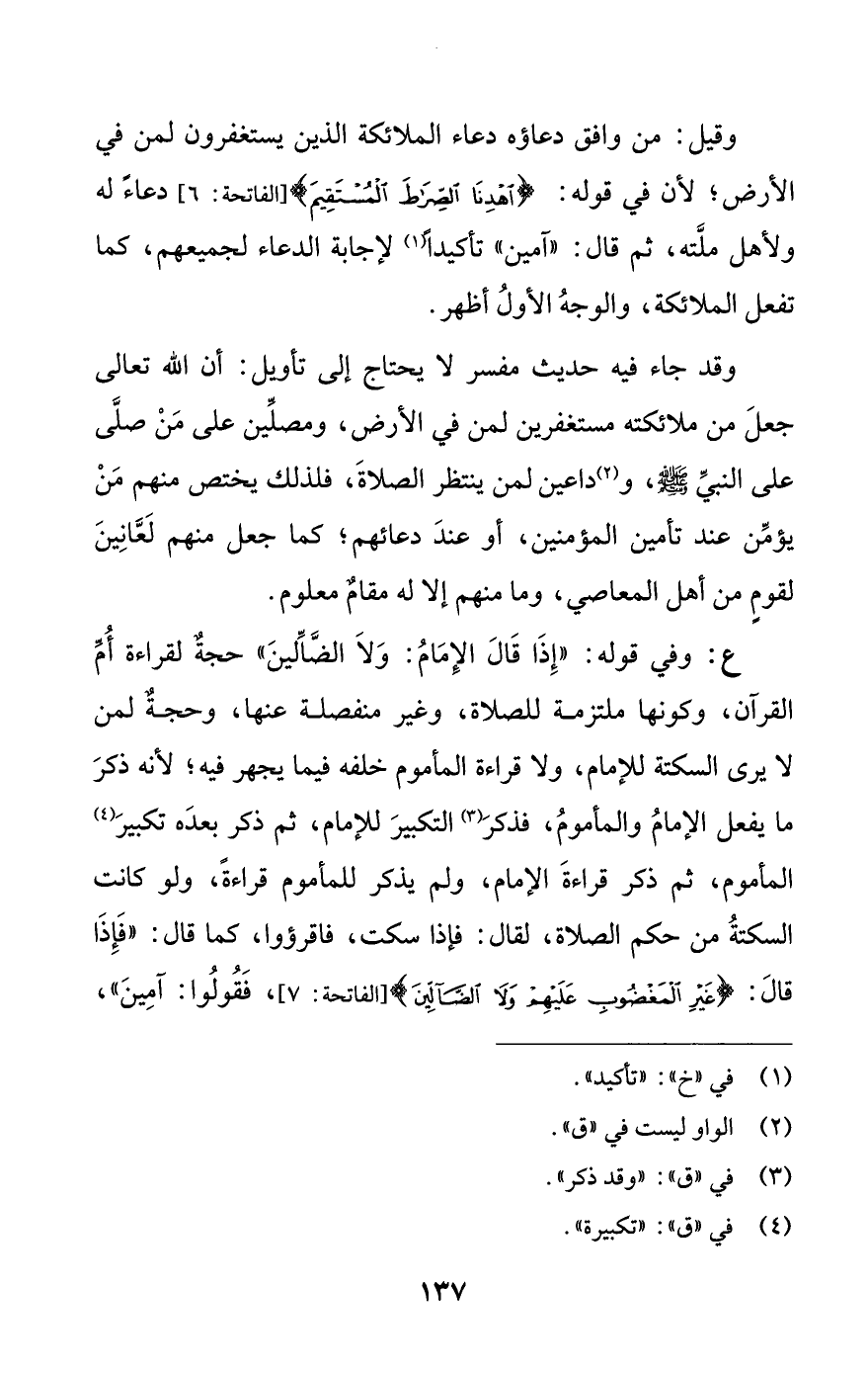 وقيل: من وافق دعاؤه دعاء الملائكة الذين يستغفرون لمن في الأرض؛ لأن في قوله: {اهْدِنَا الصِّرَاطَ الْمُسْتَقِيمَ} [الفاتحة: 6] الدعاء له ولأهل ملته، ثم قال: «آمين» تأكيدا (¬1) لإجابة الدعاء جميعه، كما تفعل الملائكة، والوجه الأول أظهر.