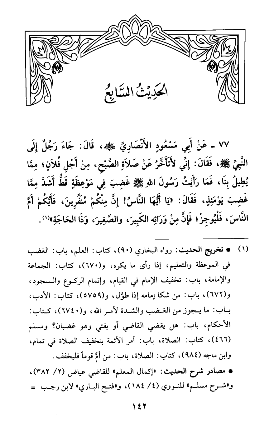 77 - عَنْ أَبِي مَسْعُودٍ الأَنْصَارِيِّ - رضي الله عنه -، قَالَ: جَاءَ رَجُلٌ إلَى النَّبِيِّ - صلى الله عليه وسلم -، فَقَالَ: إنِّي لأَتَأَخَّرُ عَنْ صَلاةِ الصُّبْحِ، مِنْ أَجْلِ فُلانٍ؛ مِمَّا يُطِيلُ بِنَا , فَمَا رَأَيْتُ رَسُولَ اللَّهِ - صلى الله عليه وسلم - غَضِبَ فِي مَوْعِظَةٍ قَطُّ أَشَدَّ مِمَّا غَضِبَ يَوْمَئِذٍ , فَقَالَ: «يَا أَيُّهَا النَّاسُ! إنَّ مِنْكُمْ مُنَفِّرِينَ , فَأَيُّكُمْ أَمَّ النَّاسَ، فَلْيُوجِزْ؛ فَإِنَّ مِنْ وَرَائِهِ الْكَبِيرَ، وَالصَّغِيرَ، وَذَا الْحَاجَةِ» (¬1).