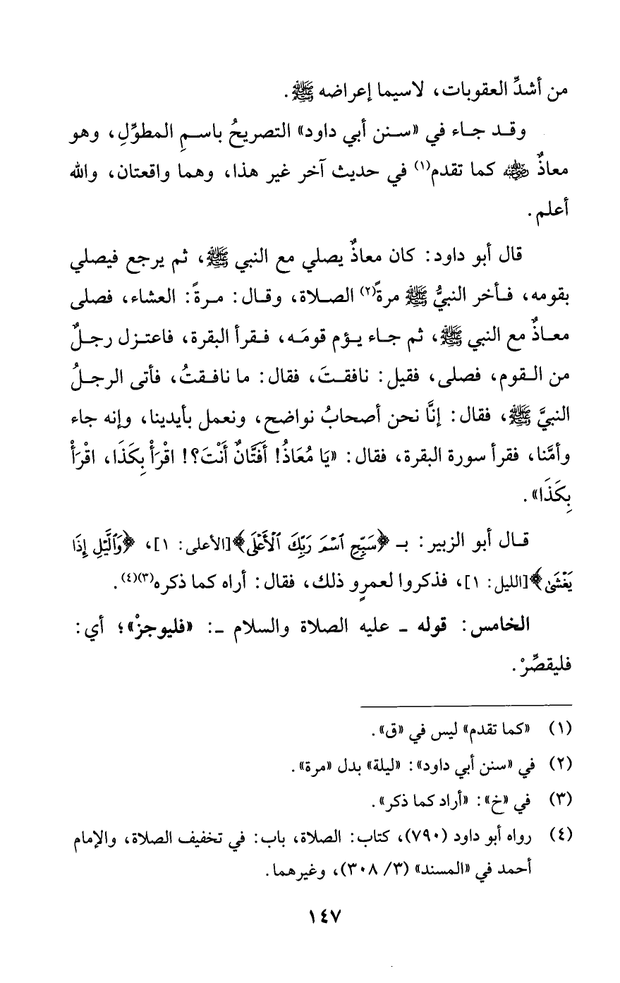 قال أبو داود: كان معاذ يصلي مع النبي - صلى الله عليه وسلم -، ثم يرجع فيصلي بقومه، فأخر النبي - صلى الله عليه وسلم - مررة (¬2) الصلاة، وقال: مرة: العشاء، فصلى معاذ مع النبي - صلى الله عليه وسلم - ثم جاء يؤم قومه، فقرأ البقرة، فاعتزل رجل من القوم، فصلى، فقيل: نافقت، فقال: ما نافقت، فأتى الرجل النبي - صلى الله عليه وسلم -، فقال: إنا نحن أصحاب نواضح، ونعمل بأيدينا، وإنه جاء وأمنا، فقرأ سورة البقرة، فقال: «يا معاذ! أفتان أنت؟! اقرأ بكذا، اقرأ بكذا».