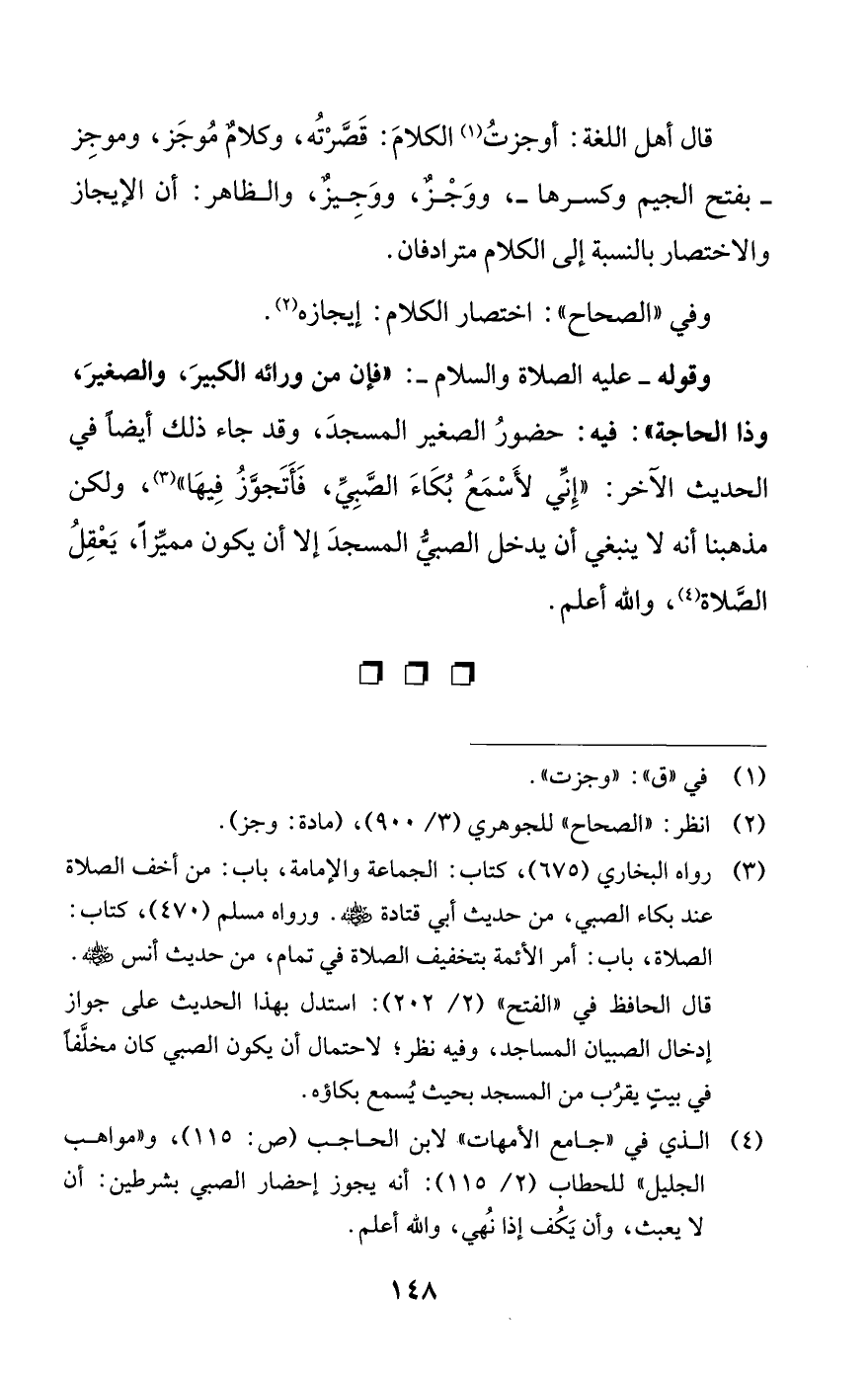(¬4) الذي في "جامع الأمهات" لابن الحاجب (ص: 115)، و"مواهب الجليل" للحطاب (2/ 115): أنه يجوز إحضار الصبي بشرطين: أن لا يعبث، وأن يَكُف إذا نُهي، والله أعلم.
