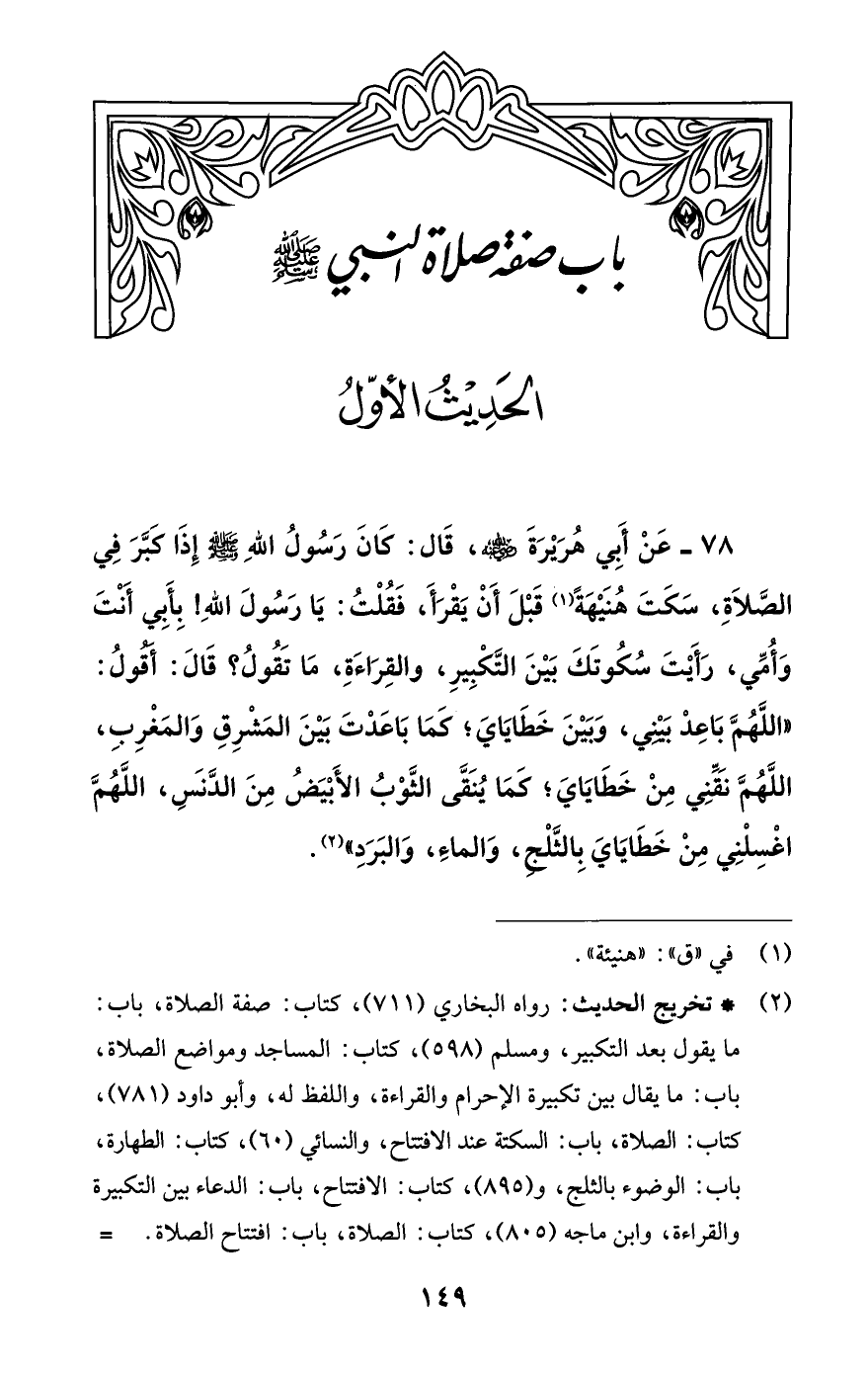 78 - عَنْ أَبِي هُرَيْرَةَ - رضي الله عنه -، قَالَ: كَانَ رَسُولُ اللَّهِ - صلى الله عليه وسلم - إذَا كَبَّرَ فِي الصَّلاةِ، سَكَتَ هُنَيْهَةً (¬1) قَبْلَ أَنْ يَقْرَأَ , فَقُلْتُ: يَا رَسُولَ اللَّهِ! بِأَبِي أَنْتَ وَأُمِّي , أَرَأَيْتَ سُكُوتَكَ بَيْنَ التَّكْبِيرِ، وَالْقِرَاءَةِ، مَا تَقُولُ؟ قَالَ: أَقُولُ: «اللَّهُمَّ بَاعِدْ بَيْنِي، وَبَيْنَ خَطَايَايَ؛ كَمَا بَاعَدْتَ بَيْنَ الْمَشْرِقِ وَالْمَغْرِبِ، اللَّهُمَّ نَقِّنِي مِنْ خَطَايَايَ؛ كَمَا يُنَقَّى الثَّوْبُ الأَبْيَضُ مِنْ الدَّنَسِ، اللَّهُمَّ اغْسِلْنِي مِنْ خَطَايَايَ بِالثَّلْجِ، وَالْمَاءِ، وَالْبَرَدِ» (¬2).