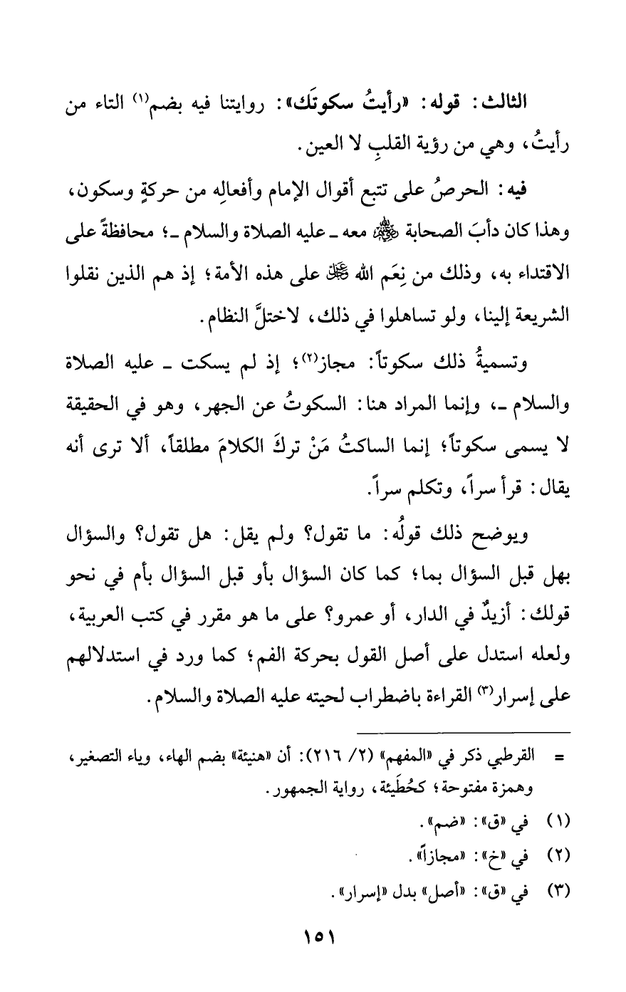 وتسمية ذلك سكوتا: مجاز (¬2)؛ إذ لم يسكت -عليه الصلاة والسلام-، وإنما المراد هنا: السكت على الجهر، وهو في الحقيقة لا يسمى سكوتا؛ إنما الساكت من ترك الكلام مطلقا، ألا ترى أنه يقال: قرأ سرا، وتكلم سرا.