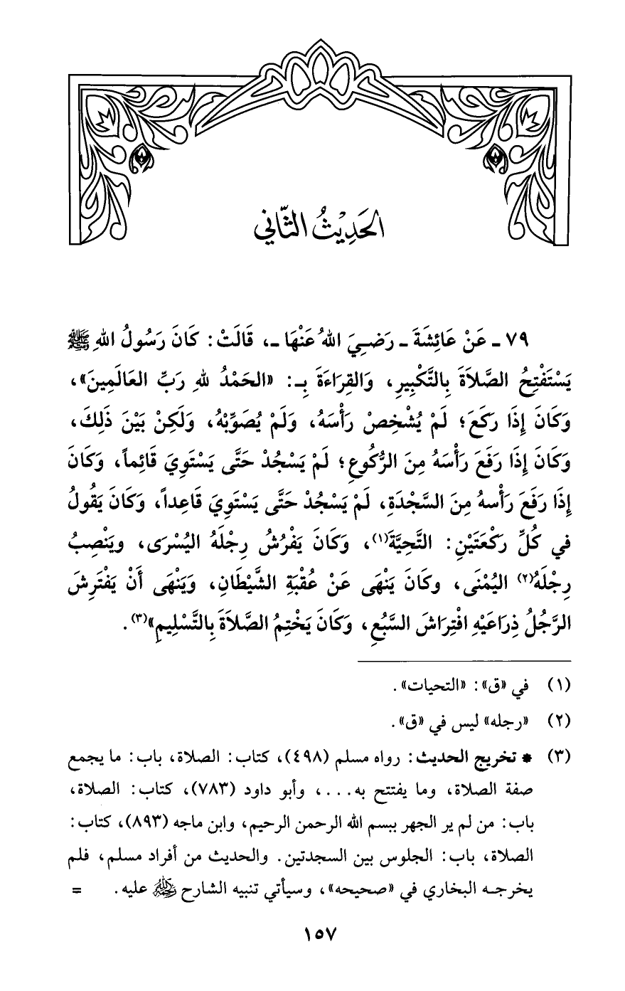 79 - عَنْ عَائِشَةَ رضي الله عنها، قَالَتْ: كَانَ رَسُولُ اللَّهِ - صلى الله عليه وسلم - يَسْتَفْتِحُ الصَّلاةَ بِالتَّكْبِيرِ , وَالْقِرَاءَةَ بـ «الْحَمْدُ لِلَّهِ رَبِّ الْعَالَمِينَ»، وَكَانَ إذَا رَكَعَ؛ لَمْ يُشْخِصْ رَأْسَهُ، وَلَمْ يُصَوِّبْهُ، وَلَكِنْ بَيْنَ ذَلِكَ , وَكَانَ إذَا رَفَعَ رَأْسَهُ مِنْ الرُّكُوعِ؛ لَمْ يَسْجُدْ حَتَّى يَسْتَوِيَ قَائِماً , وَكَانَ إذَا رَفَعَ رَأْسَهُ مِنْ السَّجْدَةِ، لَمْ يَسْجُدْ حَتَّى يَسْتَوِيَ قَاعِداً , وَكَانَ يَقُولُ فِي كُلِّ رَكْعَتَيْنِ: التَّحِيَّةَ (¬1) , وَكَانَ يَفْرُشُ رِجْلَهُ الْيُسْرَى، وَيَنْصِبُ رِجْلَهُ (¬2) الْيُمْنَى , وَكَانَ يَنْهَى عَنْ عُقْبَةِ الشَّيْطَانِ، وَيَنْهَى أَنْ يَفْتَرِشَ الرَّجُلُ ذِرَاعَيْهِ افْتِرَاشَ السَّبُعِ , وَكَانَ يَخْتِمُ الصَّلاةَ بِالتَّسْلِيمِ (¬3).