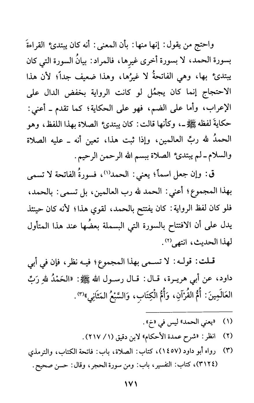 ق: وإن جعل اسما؛ يعني: الحمد (¬1)، فسورةة الفاتحة لا تسمى بهذا النمجموع؛ أعني: الحمد لله رب العالمين، بل تسمى: بالحمد، فلو كان لفظ الرواية: كان يفتتح بالحمد، لقوي هذا؛ لأنه كان حينئذ يدل على أن الافتتاح بالسورة التي البسملة بعضها عند هذا المتأول لهذا الحديث، انتهى (¬2).