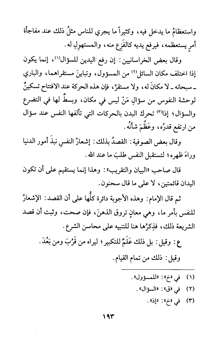 فقال بعض الخراسانيين: إن رفع اليدين للسؤال (¬1)، إنما يكون إذا اختلف مكان السائل (¬2) من المسؤول، وتباين متقراهما، والباري -سبحانه- لا مكان له، ولا مستقر، فإن هذه الحركة عند الافتتاح تسكين لوحشة النفوس من سؤال من ليس في مكان، وبسط لها في التضرع والسؤال؛ إذا (¬3) تحرك البدن بالرحكات التي تألفها النفس عند سؤال من ارتفع قدره، وعظم شأنه.