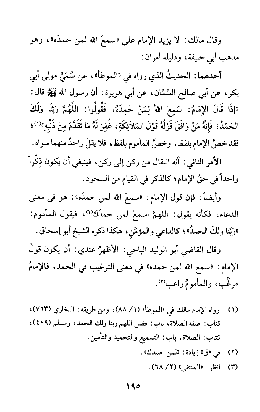 وقال مالك: لا يزيد الإمام على «سمع الله لمن حمده»، وهو مذهب أبي حنيفة، ودليله أمران: