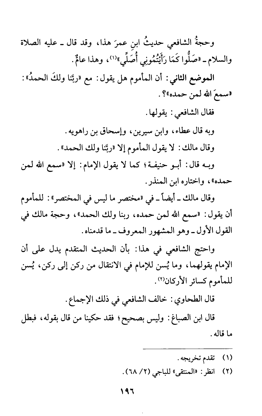 وقال مالك -أيضا- في «مختصر ما ليس في المختصر»: للمأموم أن يقول: «سمع الله لمن حمده، ربنا ولك الحمد»، وحجة مالك في القول الأول -وهو المشهور المعروف- ما قدمناه.