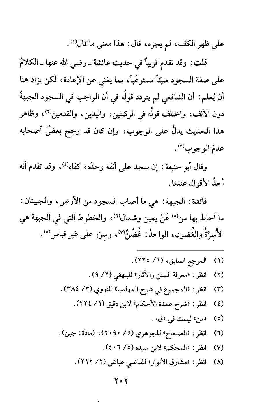 قلت: وقد تقدم قريبا في حديث عائشة - رضي الله عنها - الكلام على صفة السجود مبينا مستوعبا، بما يغني عن الإعادة، لكن يزاد هنا أن يعلم: أن الشافعي لم يتردد قوله في أن الواجب في السجود الجبهة دون الأنف، واختلف قوله في الركبتين، واليدين، والقدمين (¬2)، وظاهر هذا الحديث يدل على الوجوب، وإن كان قد رحج بعض أصحابه عدم الوجوب (¬3).