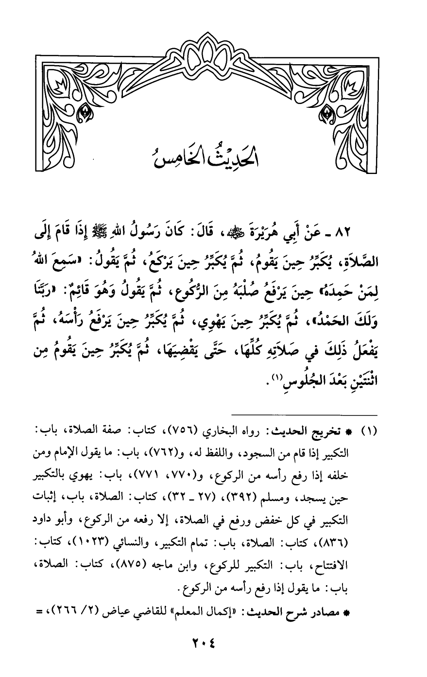 82 - عَنْ أَبِي هُرَيْرَةَ - رضي الله عنه -، قَالَ: كَانَ رَسُولُ اللَّهِ - صلى الله عليه وسلم - إذَا قَامَ إلَى الصَّلاةِ، يُكَبِّرُ حِينَ يَقُومُ , ثُمَّ يُكَبِّرُ حِينَ يَرْكَعُ , ثُمَّ يَقُولُ: «سَمِعَ اللَّهُ لِمَنْ حَمِدَهُ» حِينَ يَرْفَعُ صُلْبَهُ مِنْ الرُّكُعِ, ثُمَّ يَقُولُ وَهُوَ قَائِمٌ: «رَبَّنَا وَلَكَ الْحَمْدُ» , ثُمَّ يُكَبِّرُ حِينَ يَهْوِي , ثُمَّ يُكَبِّرُ حِينَ يَرْفَعُ رَأْسَهُ , ثُمَّ يَفْعَلُ ذَلِكَ فِي صَلاتِهِ كُلِّهَا , حَتَّى يَقْضِيَهَا , ثُمَّ يُكَبِّرُ حِينَ يَقُومُ مِنْ اثْنْتَيْنِ بَعْدَ الْجُلُوسِ (¬1).