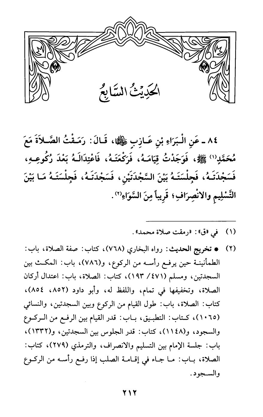 84 - عَنْ الْبَرَاءِ بْنِ عَازِبٍ رضي الله عنهما، قَالَ: رَمَقْتُ الصَّلاةَ مَعَ مُحَمَّدٍ (¬1) - صلى الله عليه وسلم -، فَوَجَدْتُ قِيَامَهُ , فَرَكْعَتَهُ، فَاعْتِدَالَهُ بَعْدَ رُكُوعِهِ , فَسَجْدَتَهُ , فَجِلْسَتَهُ بَيْنَ السَّجْدَتَيْنِ , فَسَجْدَتَهُ، فَجِلْسَتَهُ مَا بَيْنَ التَّسْلِيمِ وَالانْصِرَافِ؛ قَرِيباً مِنْ السَّوَاءِ (¬2).