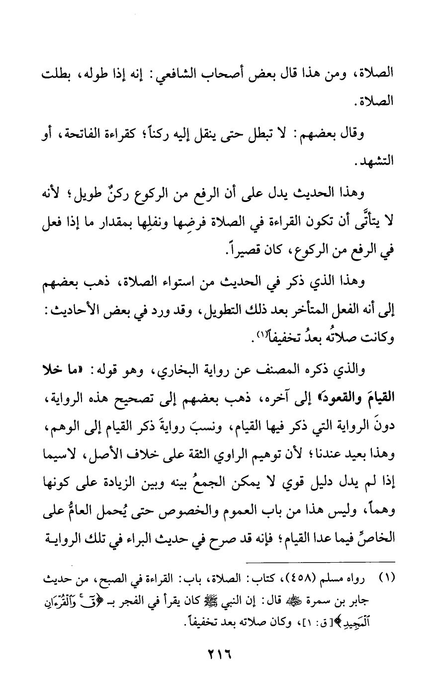 وهذا الحديث يدل على أن الرفع من الركوع ركن طويل؛ لأنه لا يتأتى أن تكون القراءة في الصلاة فرضها ونفلها بمقدار ما إذا فعل في الرفع من الركوع، كان قصيرا.