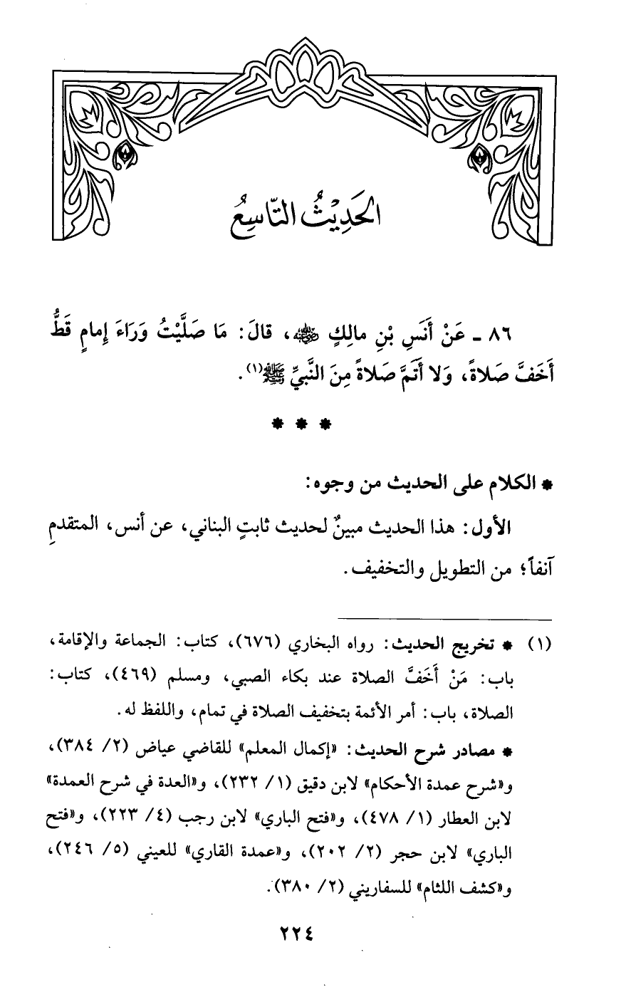 86 - عَنْ أَنَسِ بْنِ مَالِكٍ - رضي الله عنه -، قَالَ: مَا صَلَّيْتُ وَرَاءَ إمَامٍ قَطُّ أَخَفَّ صَلاةً، وَلا أَتَمَّ صّلاةً مِنَ النَّبيِّ - صلى الله عليه وسلم - (¬1).