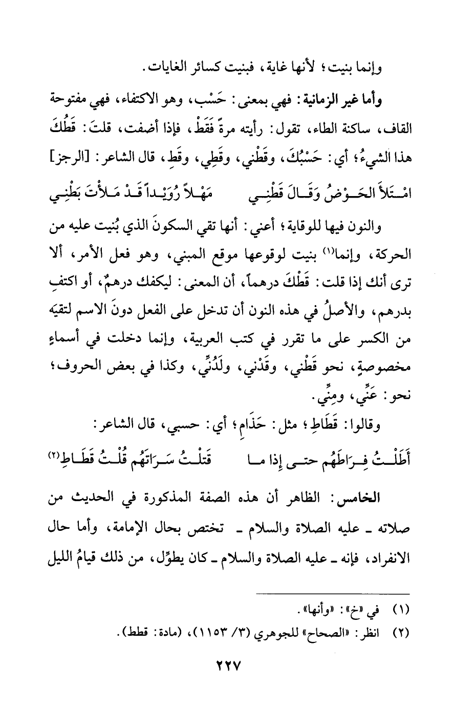 وأما غير الزمانية: فهي بمعنى: حسب، وهو الكتفاء، فهي مفتوحة القاف، ساكنة الطاء، تقول: رأيته مرة فقط، فإذا أضفت، قلت: قَطُكَ هذا الشيء؛ أي: حسبك، وقَطْني، وقطي، وَقَطِ، قال الشاعر: [الرجز]