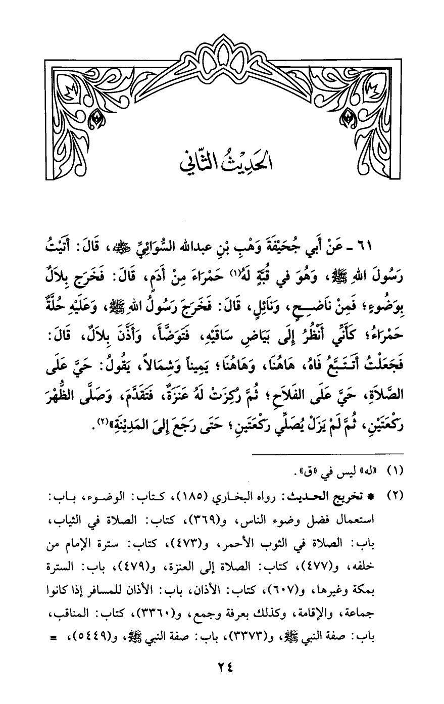 61 - عَنْ أَبِي جُحَيْفَةَ وَهْبِ بْنِ عَبْدِ اللَّهِ السُّوَائِيِّ - رضي الله عنه -، قَالَ: أَتَيْتُ رَسُولَ اللَّهِ - صلى الله عليه وسلم -، وَهُوَ فِي قُبَّةٍ لَهُ (¬1) حَمْرَاءَ مِنْ أَدَمٍ، قَالَ: فَخَرَجَ بِلالٌ بِوَضُوءٍ؛ فَمِنْ نَاضِحٍ، وَنَائِلٍ , قَالَ: فَخَرَجَ رَسُولُ اللَّهِ - صلى الله عليه وسلم -، وَعَلَيْهِ حُلَّةٌ حَمْرَاءُ؛ كَأَنِّي أَنْظُرُ إلَى بَيَاضِ سَاقَيْهِ , فَتَوَضَّأَ، وَأَذَّنَ بِلالٌ , قَالَ: فَجَعَلْتُ أَتَتَبَّعُ فَاهُ، هَهُنَا، وَهَهُنَا؛ يَمِيناً وَشِمَالاً، يَقُولُ: حَيَّ عَلَى الصَّلاةِ، حَيَّ عَلَى الْفَلاحِ؛ ثُمَّ رُكِزَتْ لَهُ عَنَزَةٌ , فَتَقَدَّمَ، وَصَلَّى الظُّهْرَ رَكْعَتَيْنِ , ثُمَّ لَمْ يَزَلْ يُصَلِّي رَكْعَتَيْنِ؛ حَتَّى رَجَعَ إلَى الْمَدِينَةِ (¬2).