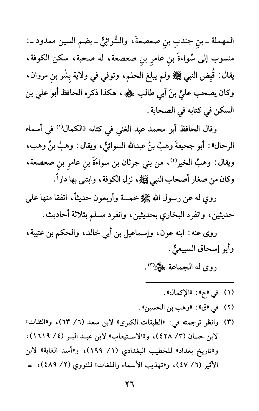 وقال لحافظ أبو محمد عبد الغني في كتابه «الكمال (¬1) في أسماء الرجال»: أبو جحيفة وهب بن عبد الله السوائي، ويقال: وهب بن وهب، ويقال: وهب الخير (¬2)، من بني جرثان بن سواءة بن عامر بن صعصعة، وكان من صغار أصحاب النبي - صلى الله عليه وسلم -، نزل الكوفة، وابتنى بها دارا.
