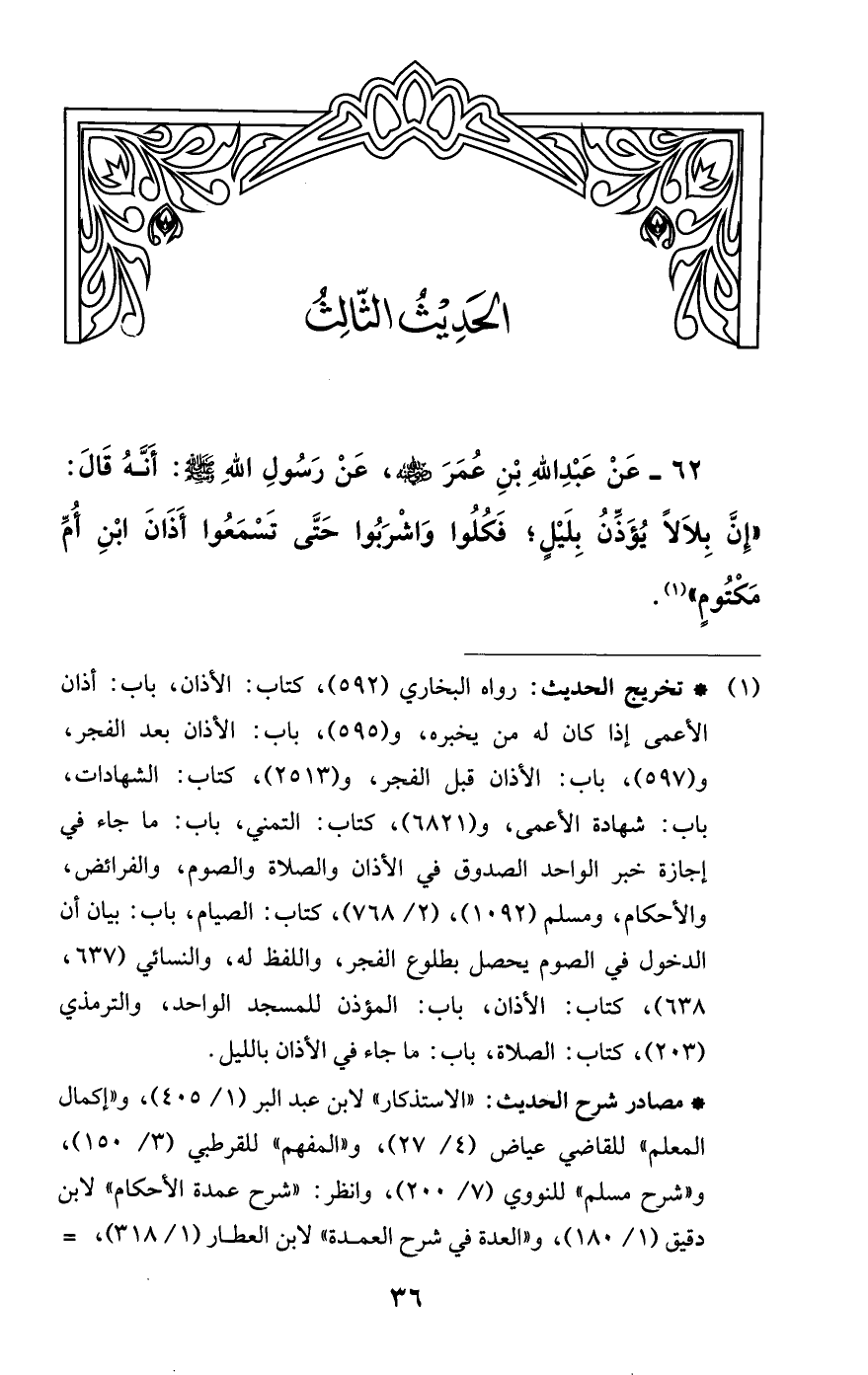 62 - عَنْ عَبْدِ اللَّهِ بْنِ عُمَرَ رضي الله عنه، عَنْ رَسُولِ اللَّهِ - صلى الله عليه وسلم: أَنَّهُ قَالَ: «إنَّ بِلالاً يُؤَذِّنُ بِلَيْلٍ؛ فَكُلُوا وَاشْرَبُوا حَتَّى تَسْمَعُوا أَذَانَ ابْنِ أُمِّ مَكْتُومٍ» (¬1).