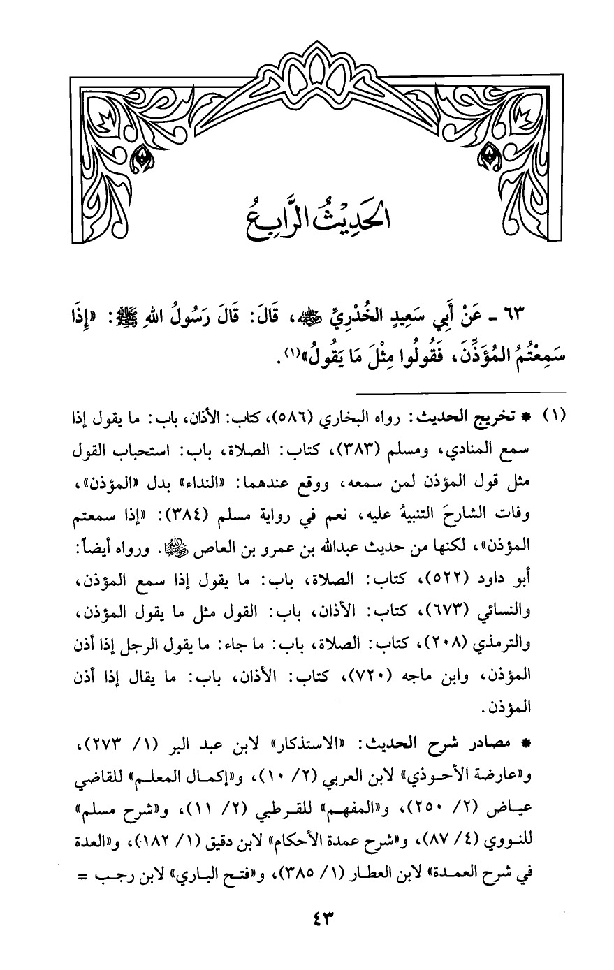 63 - عَنْ أَبِي سَعِيدٍ الْخُدْرِيِّ - رضي الله عنه -، قَالَ: قَالَ رَسُولُ اللَّهِ - صلى الله عليه وسلم -: «إذَا سَمِعْتُمُ الْمُؤَذِّنَ، فَقُولُوا مِثْلَ مَا يَقُولُ» (¬1).