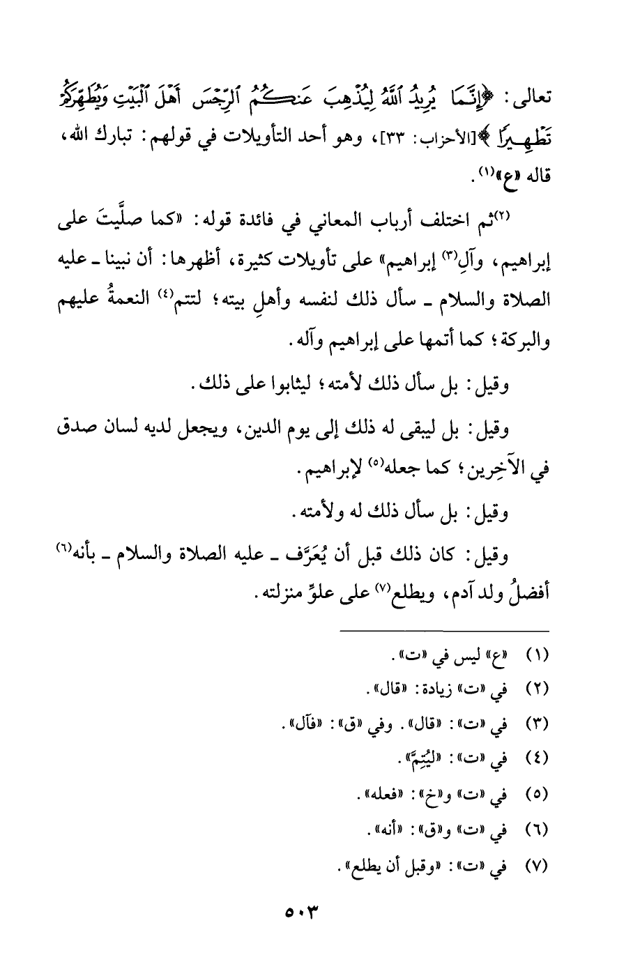 تعالى: {إِنَّمَا يُرِيدُ اللَّهُ لِيُذْهِبَ عَنْكُمُ الرِّجْسَ أَهْلَ الْبَيْتِ وَيُطَهِّرَكُمْ تَطْهِيرًا} [الأحزاب: 33] , وهو أحد التأويلات في قولهم: تبارك اللَّه، قاله "ع" (¬1).