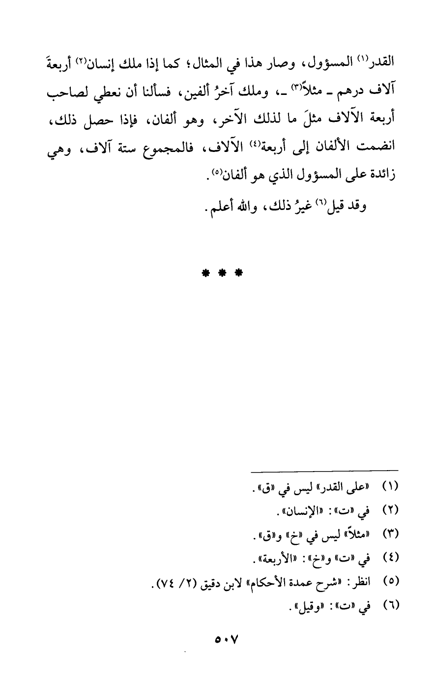 القدر (¬1) المسؤول، وصار هذا في المثال؛ كما إذا ملك إنسان (¬2) أربعةَ آلاف درهم -مثلًا (¬3) -، وملك آخرُ ألفين، فسألنا أن نعطي لصاحب أربعة الآلاف مثلَ ما لذلك الآخر، وهو ألفان، فإذا حصل ذلك، انضمت الألفان إلى أربعة (¬4) الآلاف، فالمجموع ستة آلاف، وهي زائدة على المسؤول الذي هو ألفان (¬5).