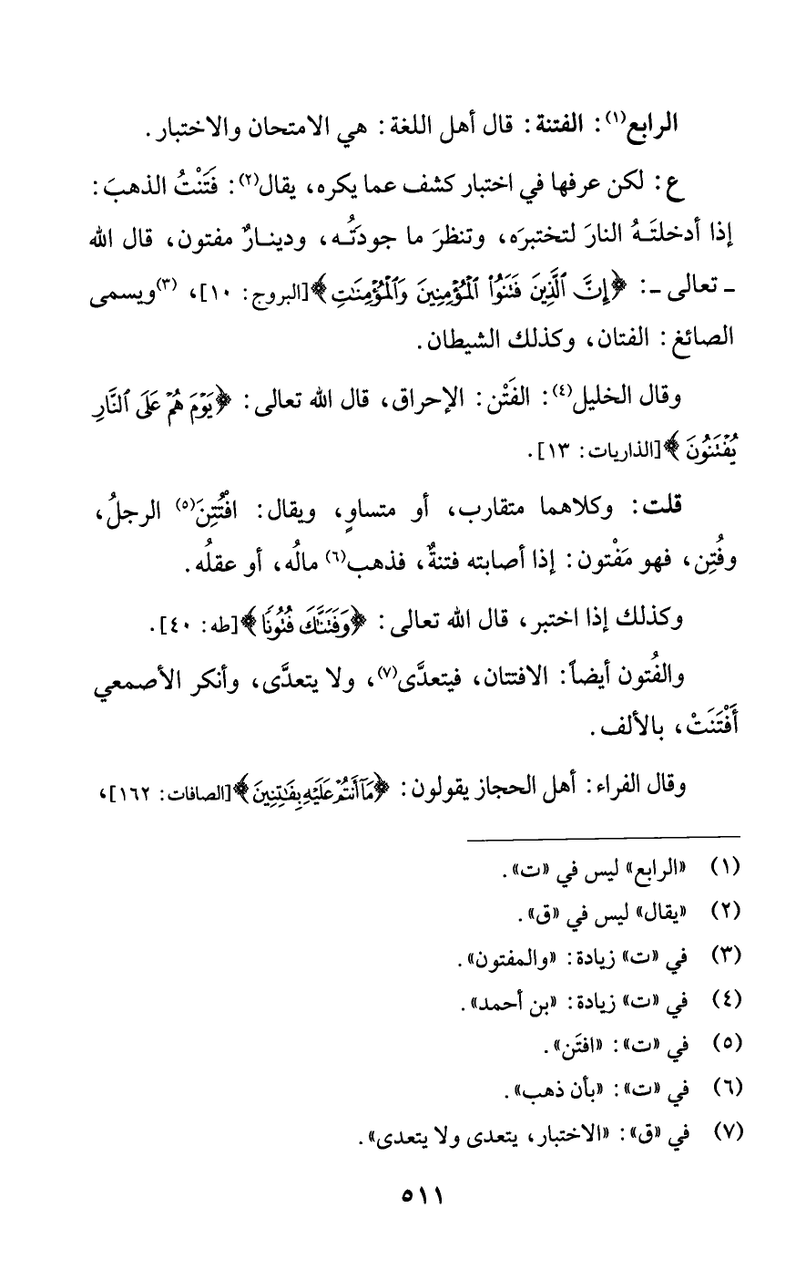 ع: لكن عرفها في اختبار كشف عما يكره، يقال (¬2): فَتَنْتُ الذهبَ: إذا أدخلتَهُ النارَ لتختبرَه، وتنظرَ ما جودته، ودينارٌ مفتون، قال اللَّه -تعالى-: {إِنَّ الَّذِينَ فَتَنُوا الْمُؤْمِنِينَ وَالْمُؤْمِنَاتِ} [البروج: 10]، (¬3) ويسمى الصائغ: الفتان، وكذلك الشيطان.