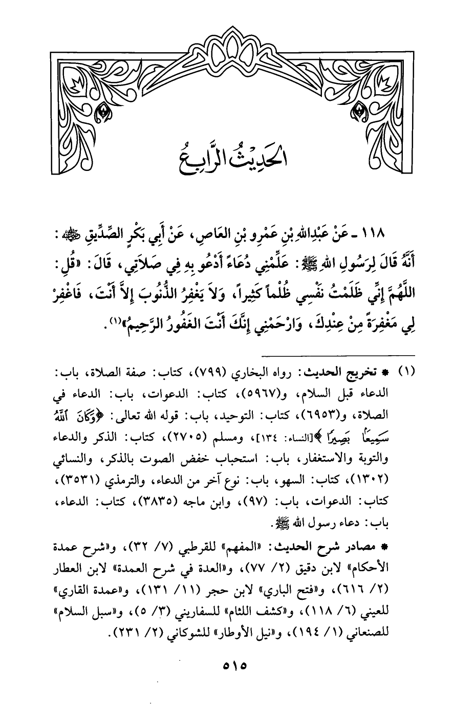 118 - عَنْ عَبْدِ اللَّهِ بْنِ عَمْرِو بْنِ العَاصِ، عنْ أَبِي بَكْرٍ الصِّدِّيقِ -رضي اللَّه عنه-: أَنَّهُ قَالَ لِرَسُولِ اللَّهِ -صلى اللَّه عليه وسلم-: عَلِّمْنِي دُعَاءً أَدْعُو بِهِ في صَلَاتِي، قَالَ: "قُلِ: اللَّهُمَّ إِنِّي ظَلَمْتُ نَفْسِي ظُلْمًا كَثِيرًا، وَلَا يَغْفِرُ الذُّنُوبَ إِلَّا أَنْتَ، فَاغْفِرْ لِي مَغْفِرَةً مِنْ عِنْدِكَ، وَارْحَمْنِي إِنَّكَ أَنْتَ الغَفُورُ الرَّحِيمُ" (¬1).