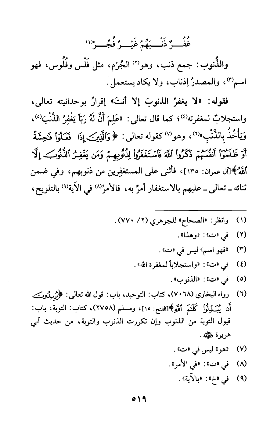 فقوله: "لا يغفرُ الذنوبَ إلا أنتَ" إقرارٌ بوحدانيته تعالى، واستجلابٌ لمغفرته (¬4)؛ كما قال تعالى: "عَلِمَ أَنَّ لَهُ رَبًّا يَغْفِرُ الذَّنْبَ (¬5)، وَيَأْخُذُ بِالذَّنْبِ" (¬6)، وهو (¬7) كقوله تعالى: {وَالَّذِينَ إِذَا فَعَلُوا فَاحِشَةً أَوْ ظَلَمُوا أَنْفُسَهُمْ ذَكَرُوا اللَّهَ فَاسْتَغْفَرُوا لِذُنُوبِهِمْ وَمَنْ يَغْفِرُ الذُّنُوبَ إِلَّا اللَّهُ} [آل عمران: 135] , فأثنى على المستغفِرين من ذنوبهم، وفي ضمن ثنائه -تعالى- عليهم بالاستغفار أمرٌ به، فالأمرُ (¬8) في الآية (¬9) بالتلويح،