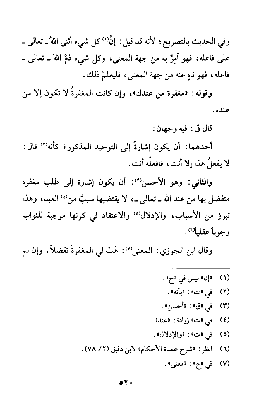 والثاني: وهو الأحسن (¬3): أن يكون إشارة إلى طلب مغفرة متفضل بها من عند اللَّه -تعالى-، لا يقتضيها سببٌ من (¬4) العبد، وهذا تبرؤ من الأسباب، والإدلال (¬5) والاعتقاد في كونها موجبة للثواب وجوبًا عقليًا (¬6).