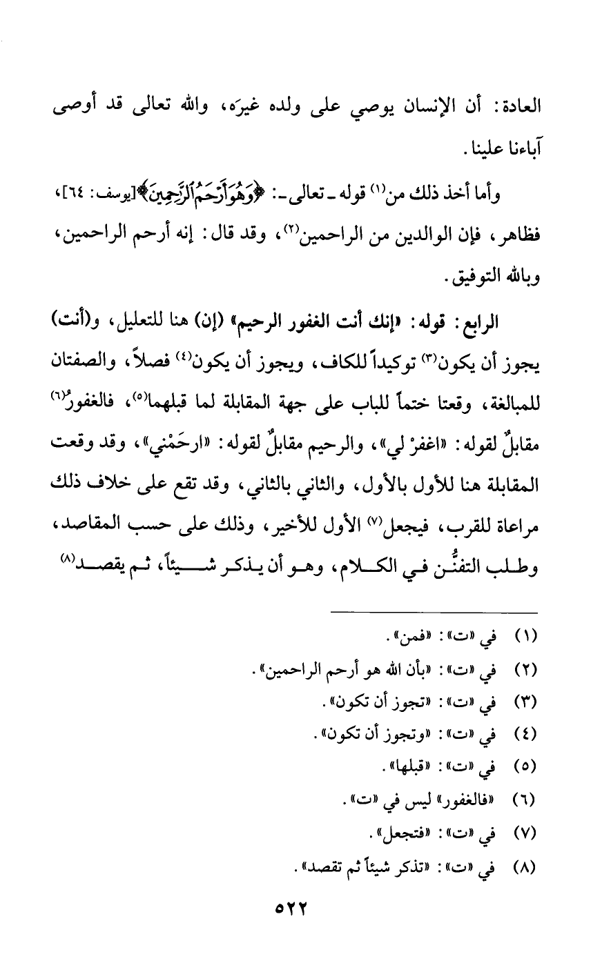 الرابع: قوله: "إنك أنت الغفور الرحيم" (إن) هنا للتعليل، و (أنت) يجوز أن يكون (¬3) توكيدًا للكاف، ويجوز أن يكون (¬4) فصلًا، والصفتان للمبالغة، وقعتا ختمًا للباب على جهة المقابلة لما قبلهما (¬5)، فالغفورُ (¬6) مقابلٌ لقوله: "اغفرْ لي"، والرحيم مقابلٌ لقوله: "ارحَمْني"، وقد وقعت المقابلة هنا للأول بالأول، والثاني بالثاني، وقد تقع على خلاف ذلك مراعاة للقرب، فيجعل (¬7) الأول للأخير، وذلك على حسب المقاصد، وطلب التفنُّن في الكلام، وهو أن يذكر شيئًا، ثم يقصد (¬8)