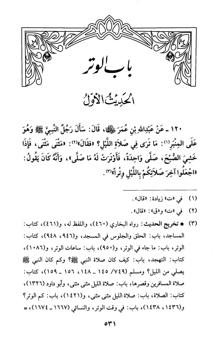 رواه البخاري (460)، واللفظ له، و (461)، كتاب: المساجد، باب: الحلق والجلوس في المسجد، و (946، 948)، كتاب: الوتر، باب: ما جاء في الوتر، و (950)، باب: ساعات الوتر، و (1086)، كتاب: التهجد، باب: كيف كان صلاة النبي -صلى اللَّه عليه وسلم-؟ وكم كان النبي -صلى اللَّه عليه وسلم- يصلي من الليل؟ ومسلم (749/ 145 - 148، 156 - 159)، كتاب: صلاة المسافرين وقصرها، باب: صلاة الليل مثنى مثنى، وأبو داود (1326)، كتاب: الصلاة، باب: صلاة الليل مثنى مثنى، و (1421)، باب: كم الوتر؟ و (1436، 1438)، باب: في وقت الوتر، والنسائي (1667 - 1674)، =