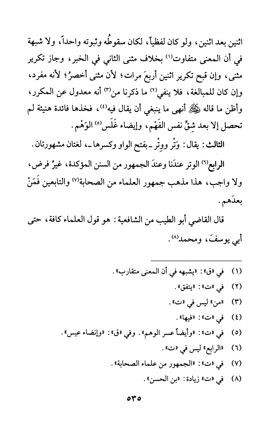 الرابع (¬6) الوتر عندَنا وعندَ الجمهور من السنن المؤكدة، غيرُ فرض، ولا واجب، هذا مذهب جمهور العلماء من الصحابة (¬7) والتابعين فَمَنْ بعدَهم.