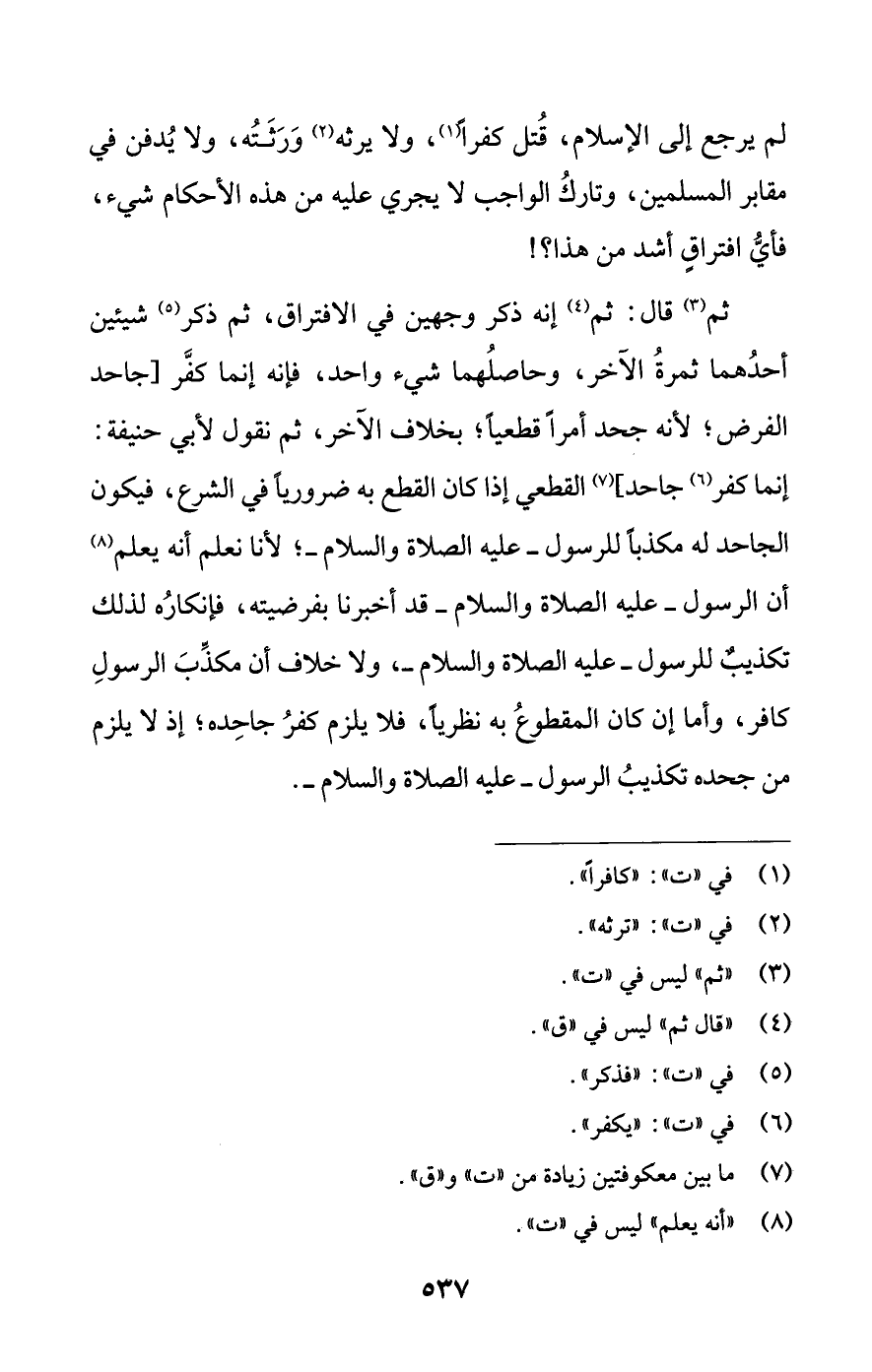 ثم (¬3) قال: ثم (¬4) إنه ذكر وجهين في الافتراق، ثم ذكر (¬5) شيئين أحدُهما ثمرةُ الآخر، وحاصلُهما شيء واحد، فإنه إنما كفَّر [جاحد الفرض؛ لأنه جحد أمرًا قطعيًا؛ بخلاف الآخر، ثم نقول لأبي حنيفة: إنما كفر (¬6) جاحد] (¬7) القطعي إذا كان القطع به ضروريًا في الشرع، فيكون الجاحد له مكذبًا للرسول -عليه الصلاة والسلام-؛ لأنا نعلم أنه يعلم (¬8) أن الرسول -عليه الصلاة والسلام- قد أخبرنا بفرضيته، فإنكارُه لذلك تكذيبٌ للرسول -عليه الصلاة والسلام-، ولا خلاف أن مكذِّبَ الرسولِ كافر، وأما إن كان المقطوعُ به نظريًا، فلا يلزم كفرُ جاحِده؛ إذ لا يلزم من جحده تكذيبُ الرسول -عليه الصلاة والسلام-.
