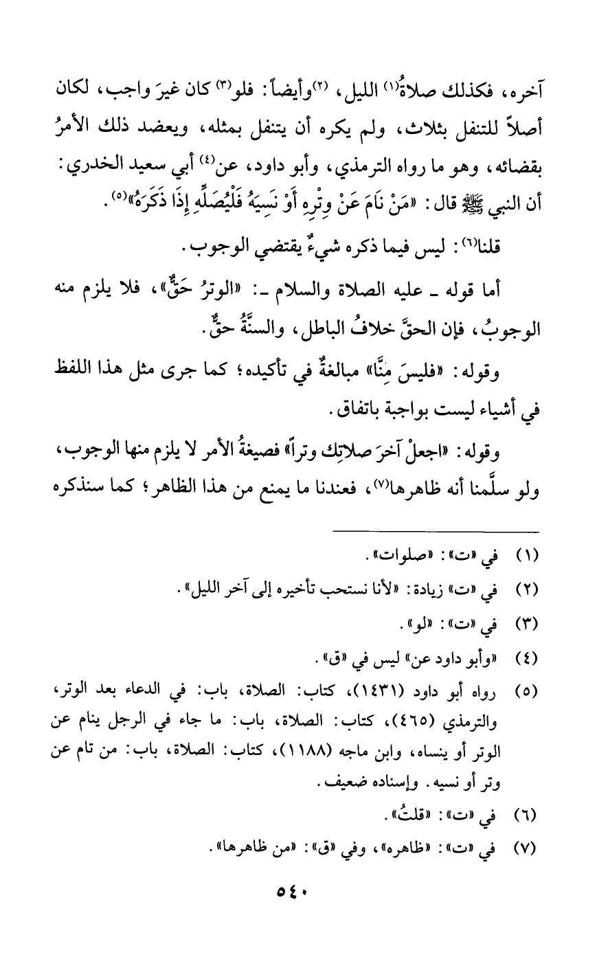 (¬5) رواه أبو داود (1431)، كتاب: الصلاة، باب: في الدعاء بعد الوتر، والترمذي (465)، كتاب: الصلاة، باب: ما جاء في الرجل ينام عن الوتر أو ينساه، وابن ماجه (1188)، كتاب: الصلاة، باب: من نام عن وتر أو نسيه. وإسناده ضعيف.