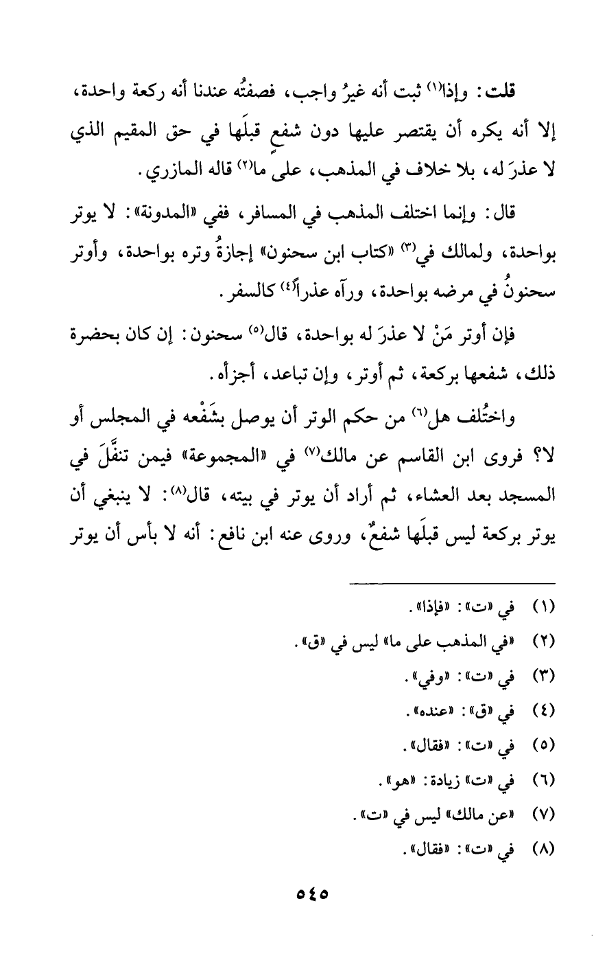 قال: وإنما اختلف المذهب في المسافر، ففي "المدونة": لا يوتر بواحدة، ولمالك في (¬3) "كتاب ابن سحنون" إجازةُ وتره بواحدة، وأوتر سحنونُ في مرضه بواحدة، ورآه عذرًا (¬4) كالسفر.