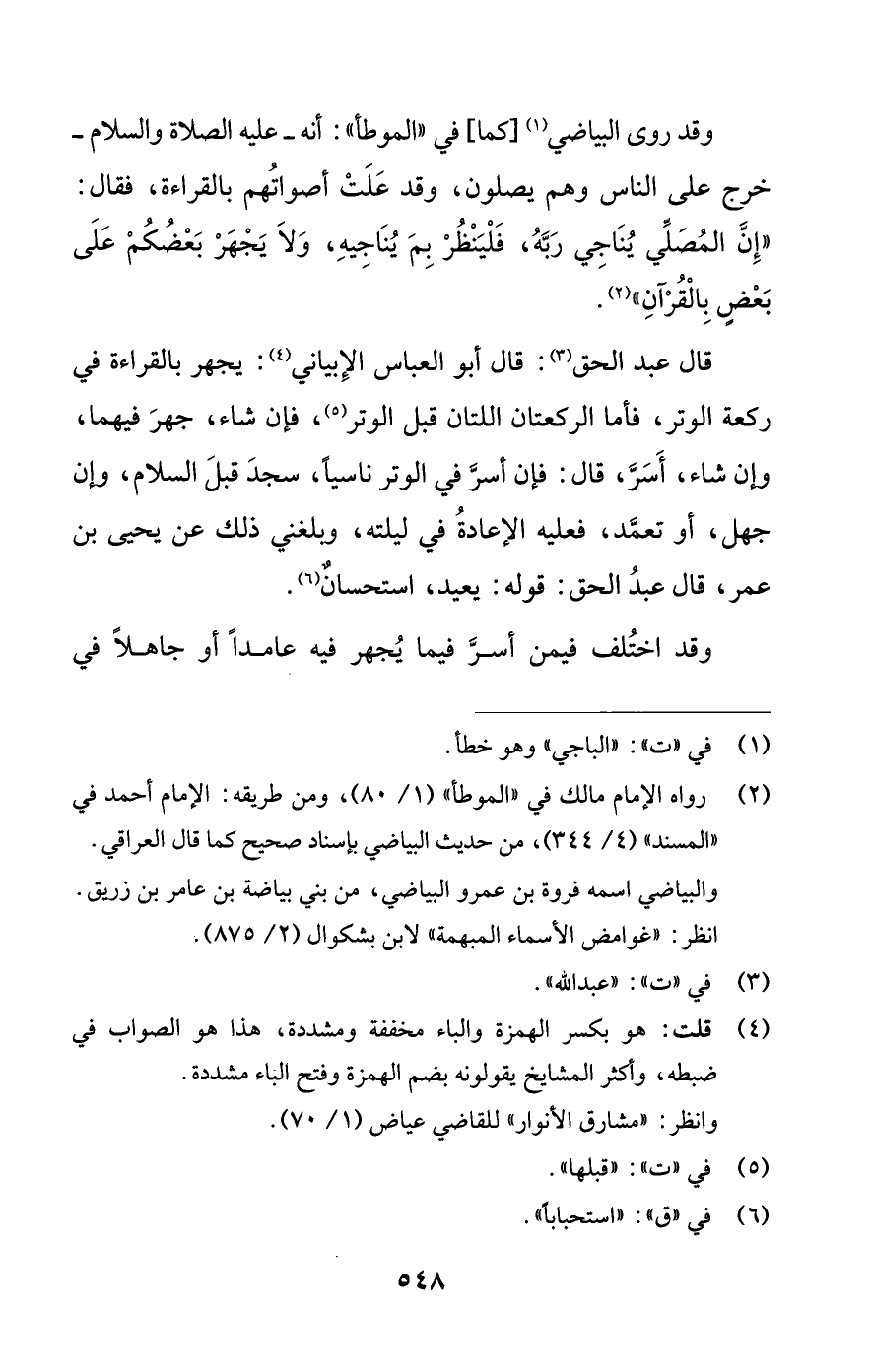 قال عبد الحق (¬3): قال أبو العباس الإِبياني (¬4): يجهر بالقراءة في ركعة الوتر، فأما الركعتان اللتان قبل الوتر (¬5)، فإن شاء، جهرَ فيهما، وإن شاء، أَسَرَّ، قال: فإن أسرَّ في الوتر ناسيًا، سجدَ قبلَ السلام، وإن جهل، أو تعمَّد، فعليه الإعادةُ في ليلته، وبلغني ذلك عن يحيى بن عمر، قال عبدُ الحق: قوله: يعيد، استحسانٌ (¬6).
