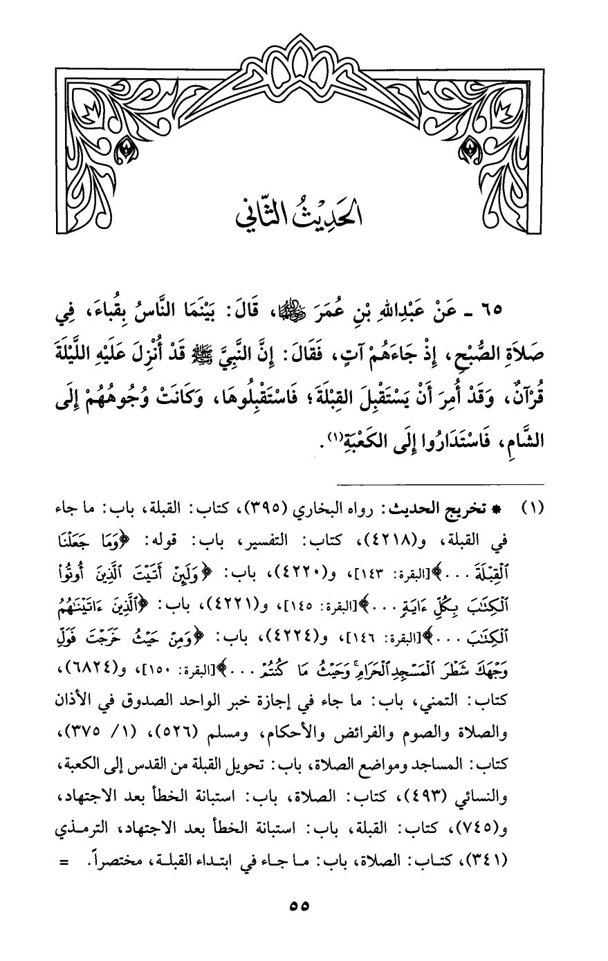 65 - عَنْ عَبْدِ اللَّهِ بْنِ عُمَرَ رضي الله عنهما، قَالَ: بَيْنَمَا النَّاسُ بِقُبَاءَ، فِي صَلاةِ الصُّبْحِ، إذْ جَاءَهُمْ آتٍ , فَقَالَ: إنَّ النَّبِيَّ - صلى الله عليه وسلم - قَدْ أُنْزِلَ عَلَيْهِ اللَّيْلَةَ قُرْآنٌ , وَقَدْ أُمِرَ أَنْ يَسْتَقْبِلَ الْقِبْلَةَ؛ فَاسْتَقْبِلُوهَا، وَكَانَتْ وُجُوهُهُمْ إلَى الشَّامِ , فَاسْتَدَارُوا إلَى الْكَعْبَةِ (¬1).