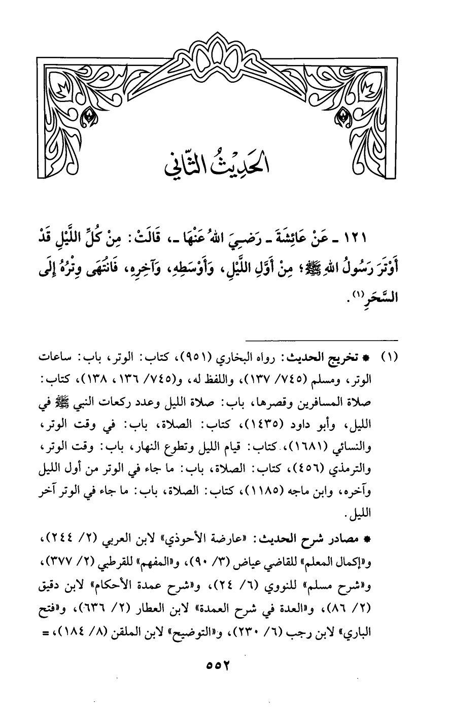 121 - عَنْ عَائِشَةَ -رَضِيَ اللَّهُ عَنْهَا-، قَالَتْ: مِنْ كُلِّ اللَّيْلِ قَدْ أَوْتَرَ رَسُولُ اللَّهِ -صلى اللَّه عليه وسلم-؛ مِنْ أَوَّلِ اللَّيْلِ، وَأَوْسَطِهِ، وَآخِرِهِ، فَانْتَهَى وِتْرُهُ إِلَى السَّحَرِ (¬1).