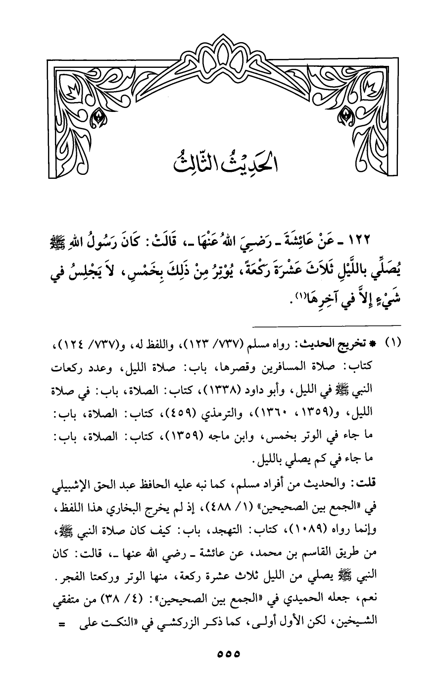 122 - عَنْ عَائِشَةَ -رَضِيَ اللَّهُ عَنْهَا-، قَالَتْ: كَانَ رَسُولُ اللَّهِ -صلى اللَّه عليه وسلم- يُصَلِّي باللَّيْلِ ثَلَاثَ عَشْرَةَ رَكعَةً، يُوْتِرُ مِنْ ذَلِكَ بِخَمْسِ، لَا يَجْلِسُ في شَيْءٍ إِلَّا في آخِرِهَا (¬1).