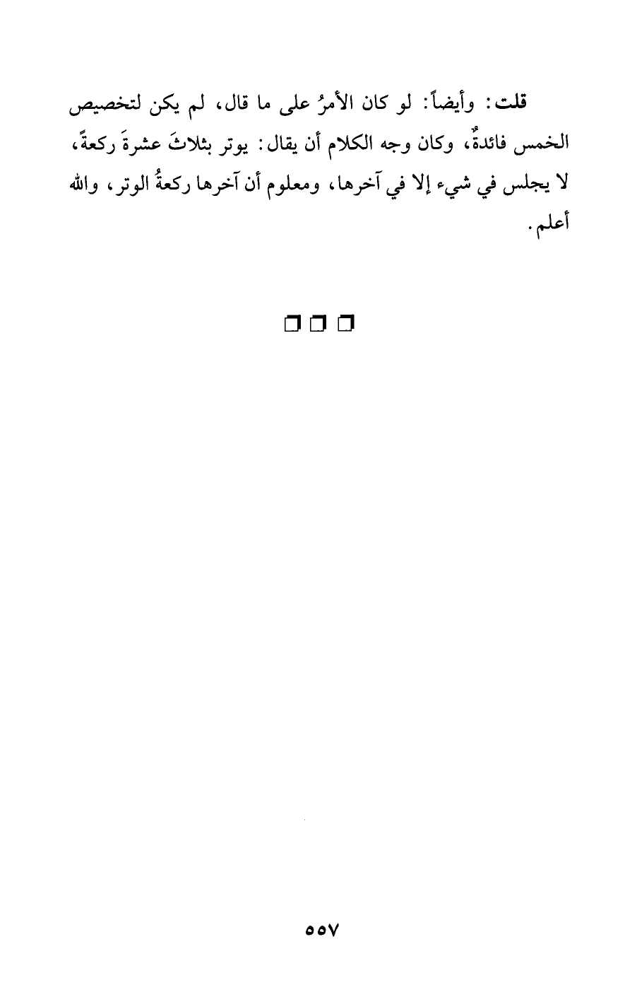 قلت: وأيضًا: لو كان الأمرُ على ما قال، لم يكن لتخصيص الخمس فائدةٌ، وكان وجه الكلام أن يقال: يوتر بثلاثَ عشرةَ ركعةً، لا يجلس في شيء إلا في آخرها، ومعلوم أن آخرها ركعةُ الوتر، واللَّه أعلم.