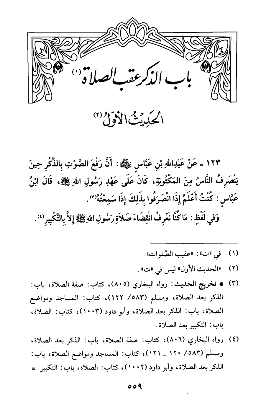 123 - عَنْ عَبْدِ اللَّهِ بْنِ عَبَّاسٍ -رضي اللَّه عنهما-: أَنَّ رَفْعَ الصَّوْتِ بِالذِّكرِ حِينَ يَنْصَرِفُ النَّاسُ مِنَ المَكْتُوبَةِ، كَانَ عَلَى عَهْدِ رَسُولِ اللَّهِ -صلى اللَّه عليه وسلم-، قَالَ ابْنُ عَبَّاسٍ: كنْتُ أَعْلَمُ إِذَا انْصَرَفُوا بِذَلِكَ إِذَا سَمِعْتُه (¬3).
