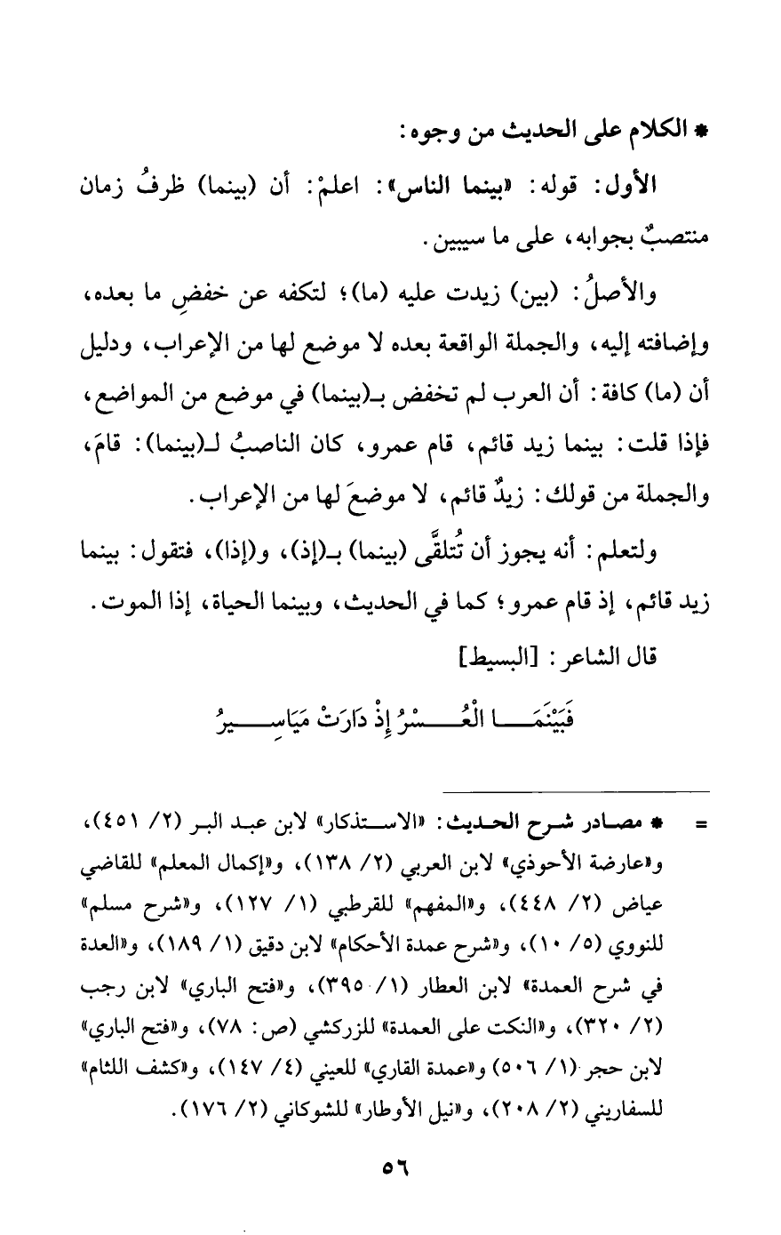 والأصل: (بين) زيدت عليه (ما)؛ لتكفه عن خفض ما بعده، وإضافته إليه، والجملة الواقعة بعده لا موضع لها من الإعراب، ودليل أن (ما) كافة: أن العرب لم تخفض ب (بينما) في موضع من المواضع، فإذا قلت: بينما وزيد قائم، قام عمرو، كان الناصب لـ (بينما): قام، والجملة من قولك: زيد قائم، لا موضع لها من الإعراب.