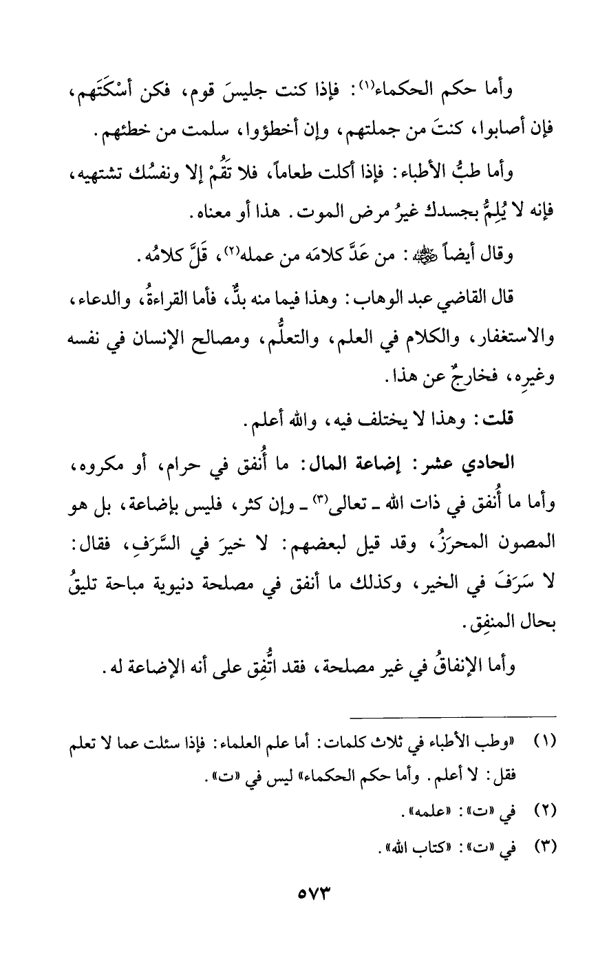 (¬1) "وطب الأطباء في ثلاث كلمات: أما علم العلماء: فإذا سئلت عما لا تعلم فقل: لا أعلم. وأما حكم الحكماء" ليس في "ت".